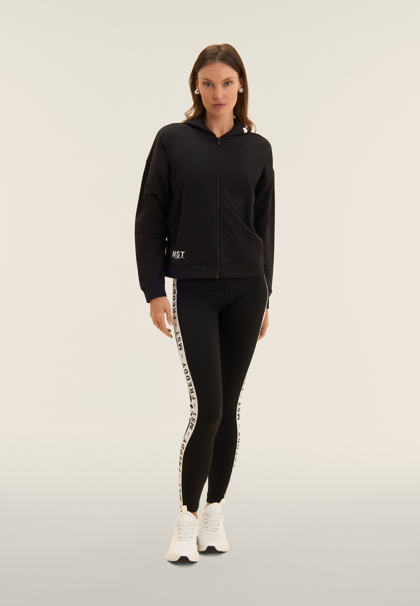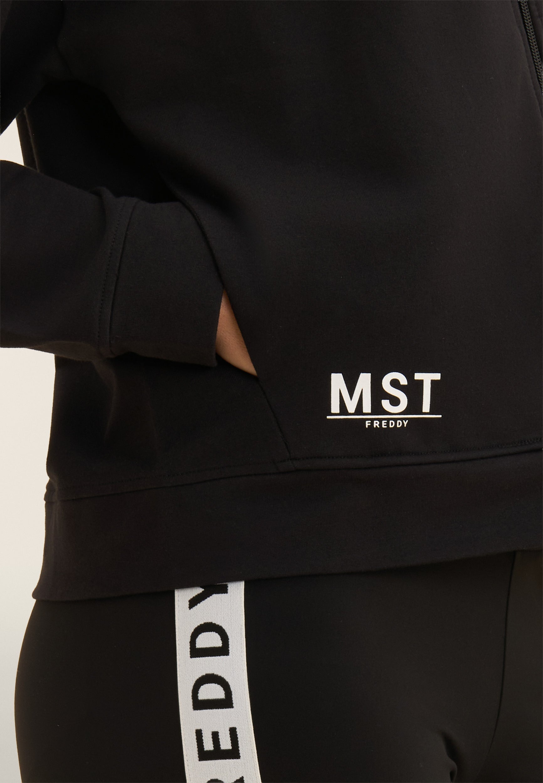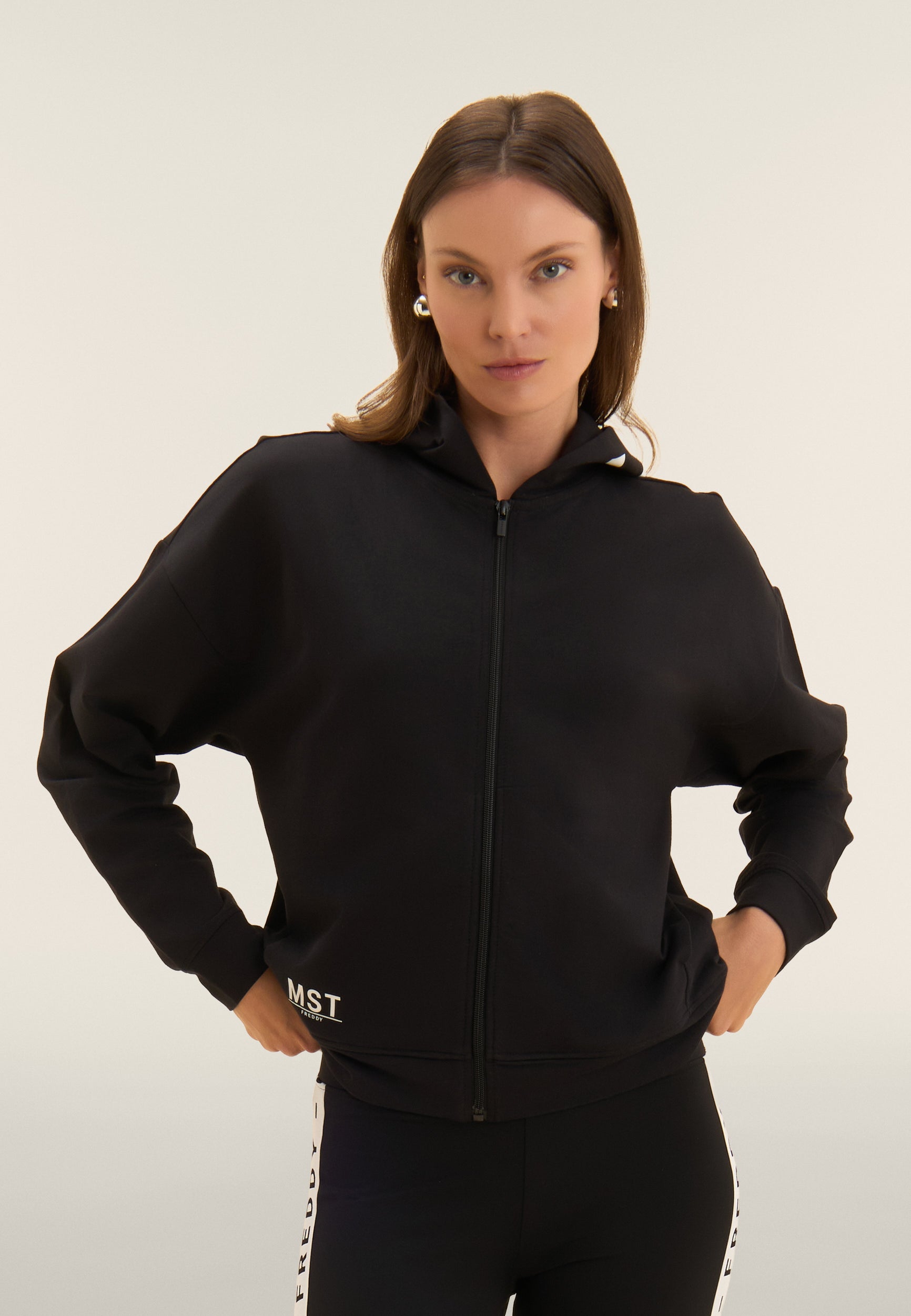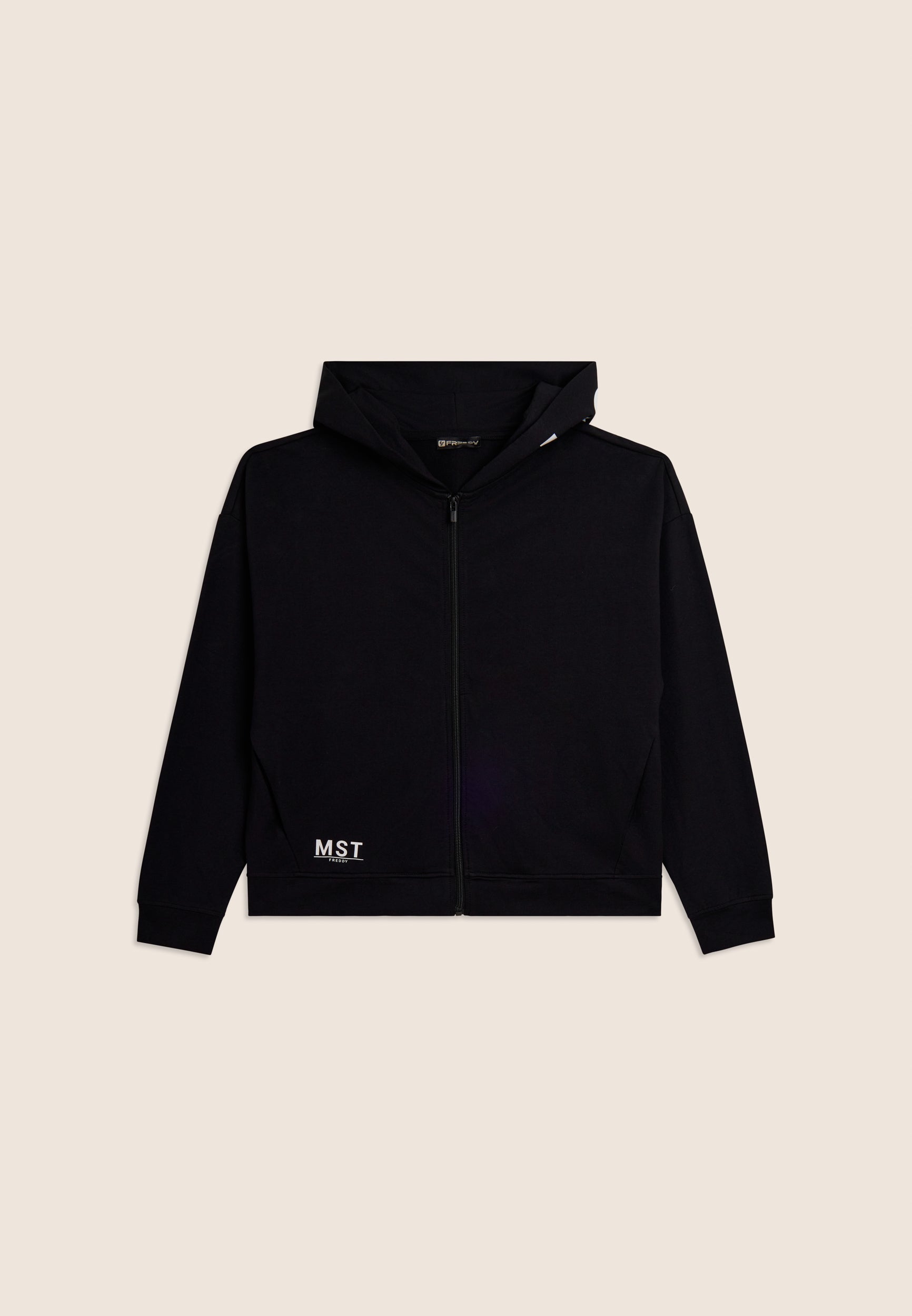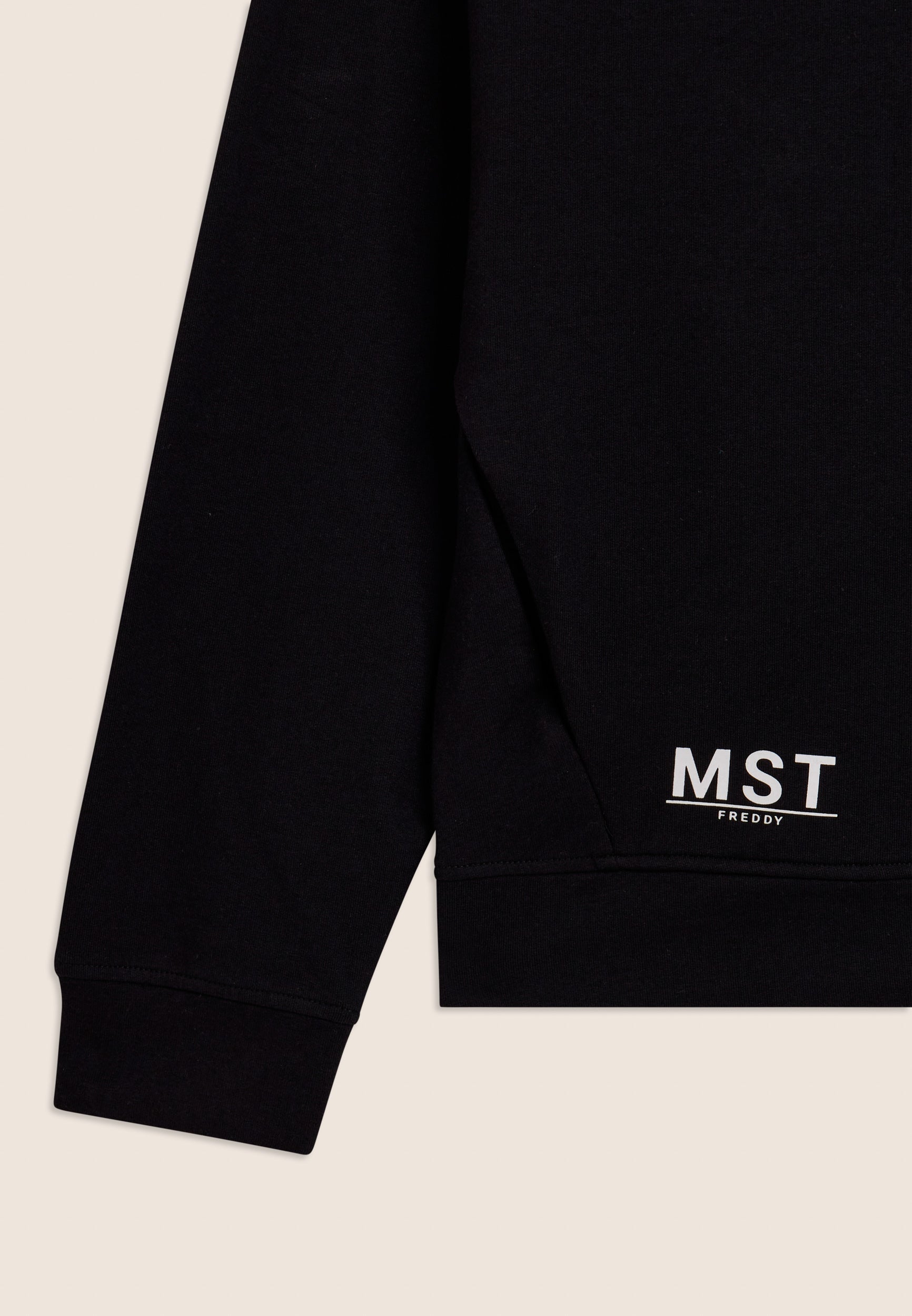 A zip hoodie made of French terry stretch cotton, offering a comfortable fit and a length just above the hips. The zip fastening and bottom band create a practical and versatile design. The sleeves with very dropped shoulders and cuffs guarantee total comfort. The MST maxi print on the right side of the hood and the small MST FREDDY print on the right bottom are elegant details that enrich the garment. Besom pockets complete this sweatshirt with its clean and functional design.