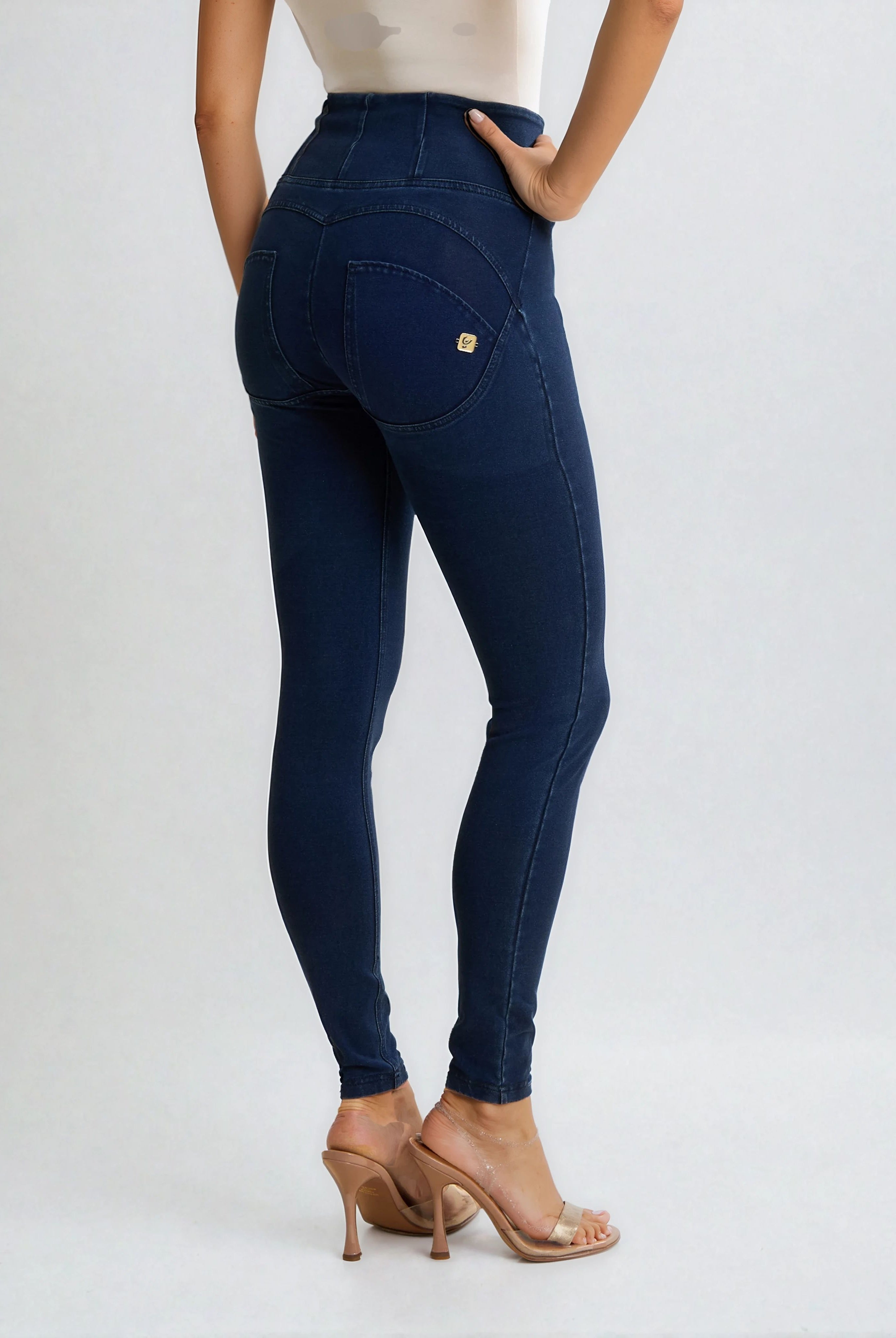 WR.UP® Pants in Blue: designed to flatter and move with you. It combines with a timeless full length, perfect for any season. Adding to that is a flattering high waist that offers gentle support. The look is completed by a sleek skinny fit that hugs your curves. Crafted combining a timeless denim aesthetic with enhanced comfort and flexibility. As part of the WR.UP® line, they feature patented technology designed to naturally enhance and sculpt your silhouette. Perfect for countless occasions, from casual to chic.