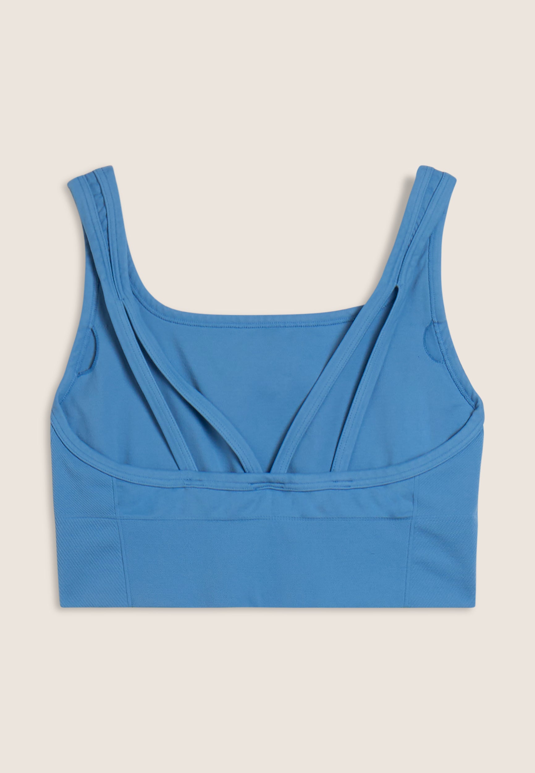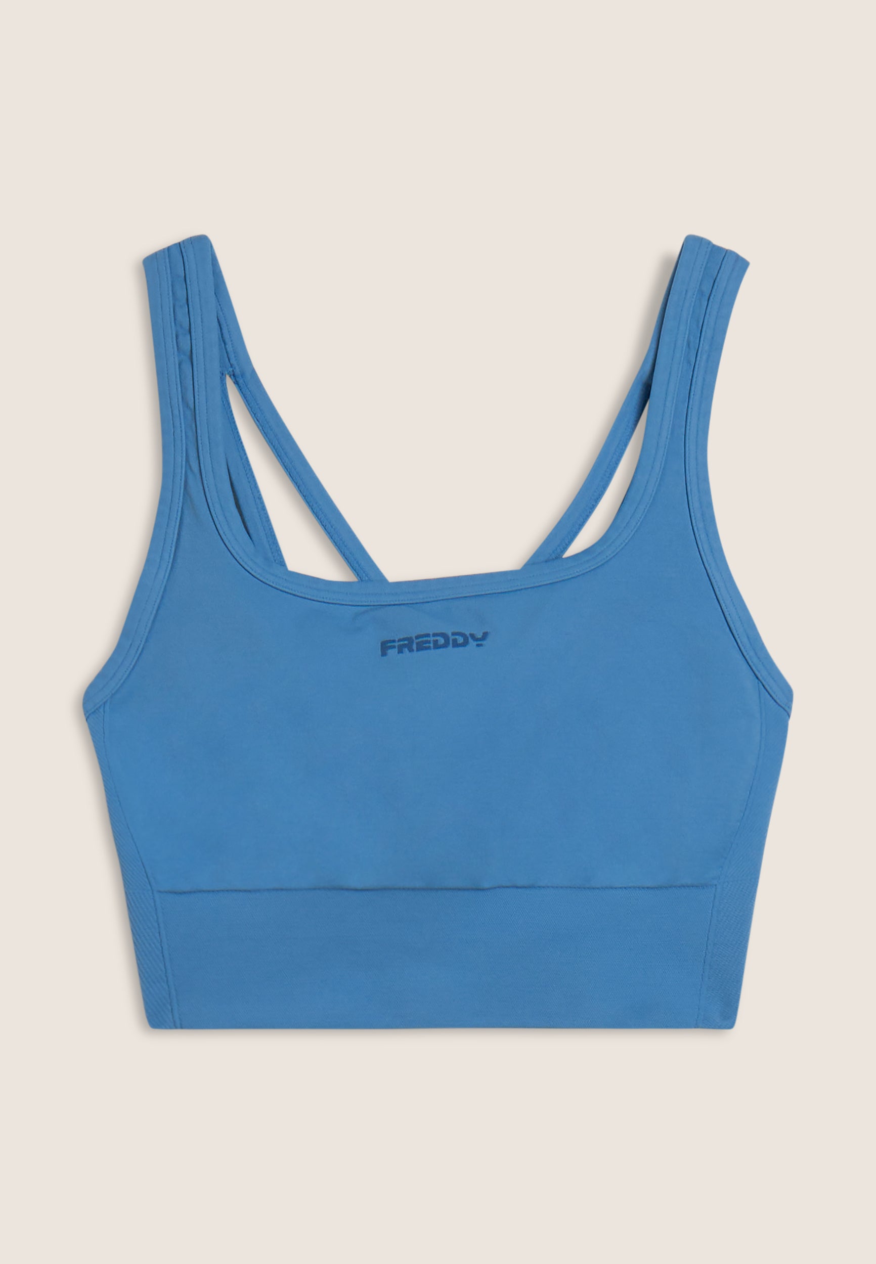 Medium support sports bra with removable moulded cups, ideal for daily training. The cut is designed to offer support and style: round neckline, regular shoulder straps crossed at the back, and side inserts in herringbone textured fabric. The nylon jersey fabric is breathable and durable.