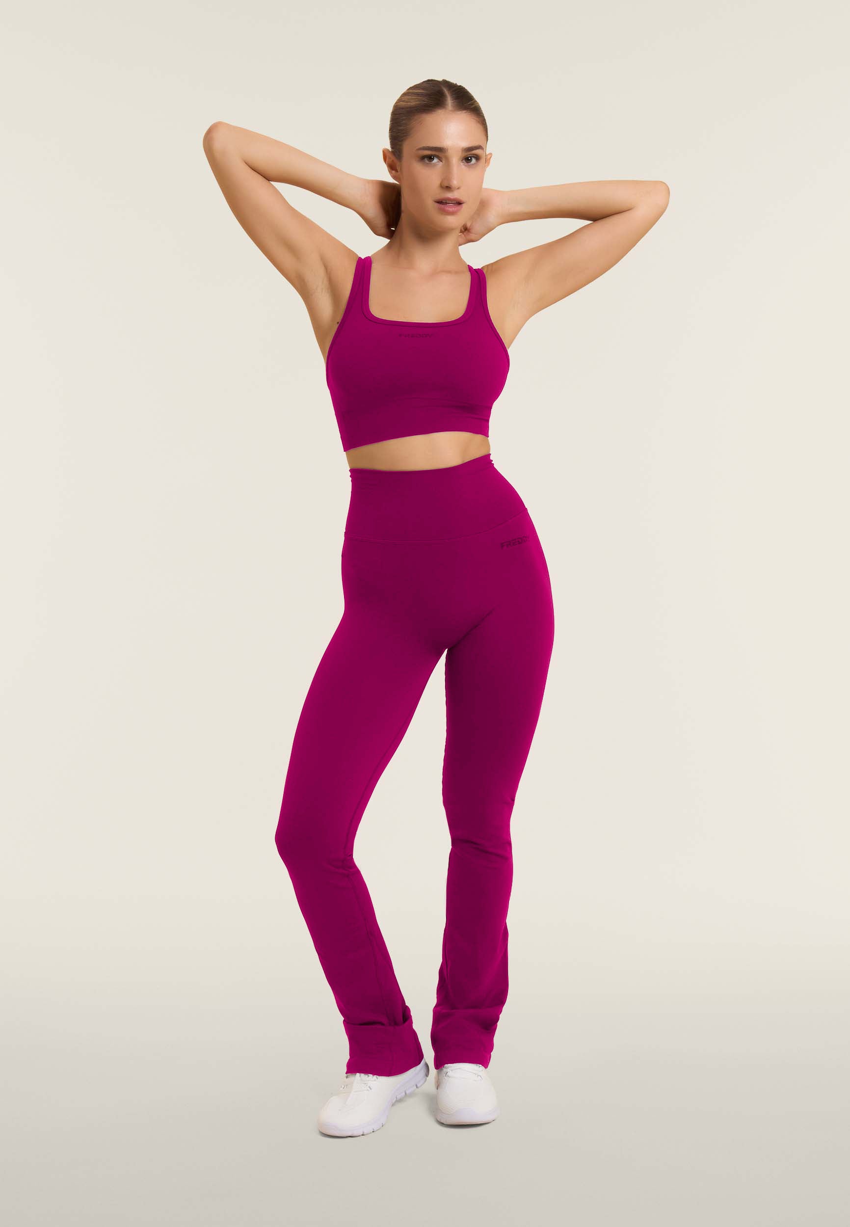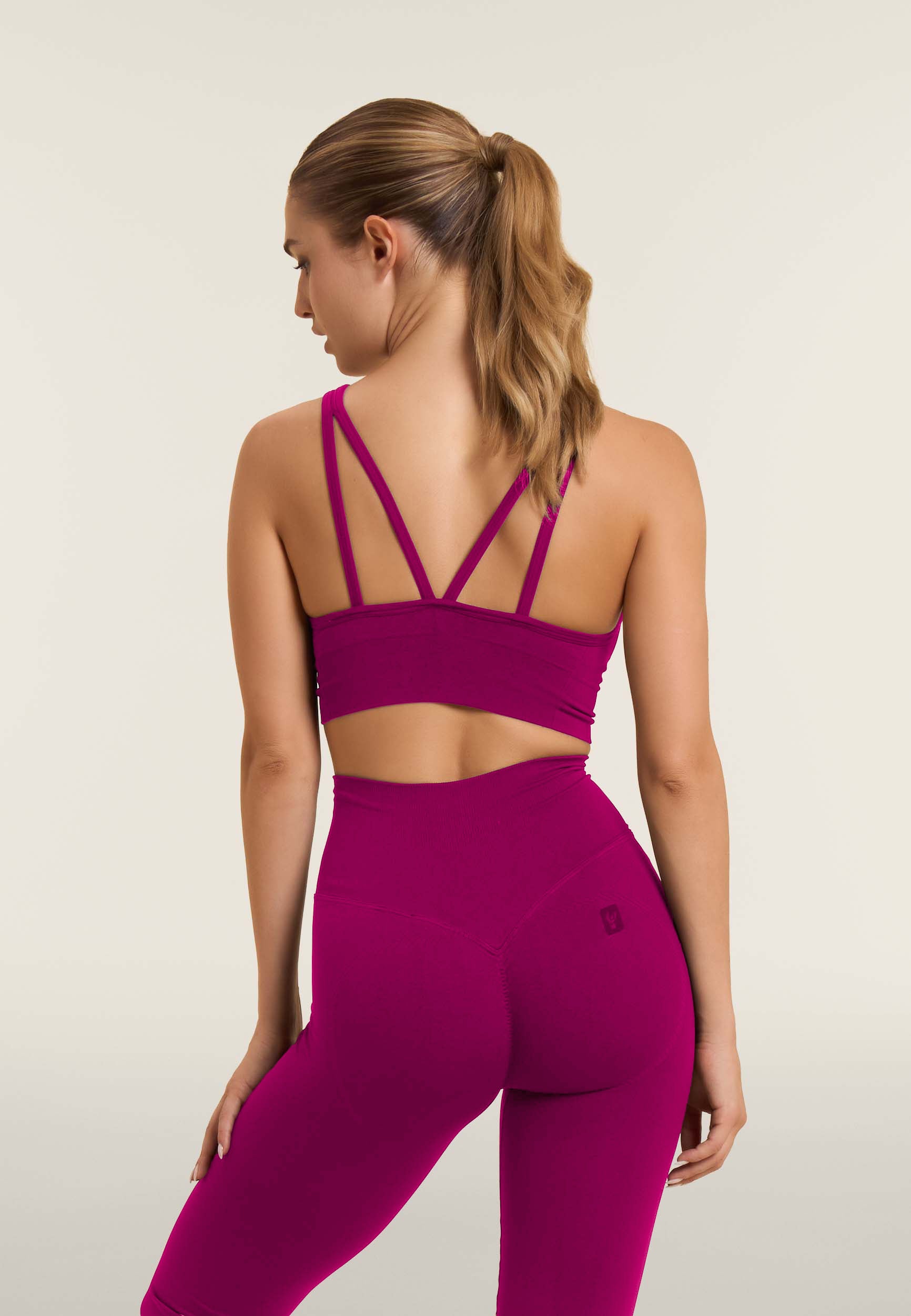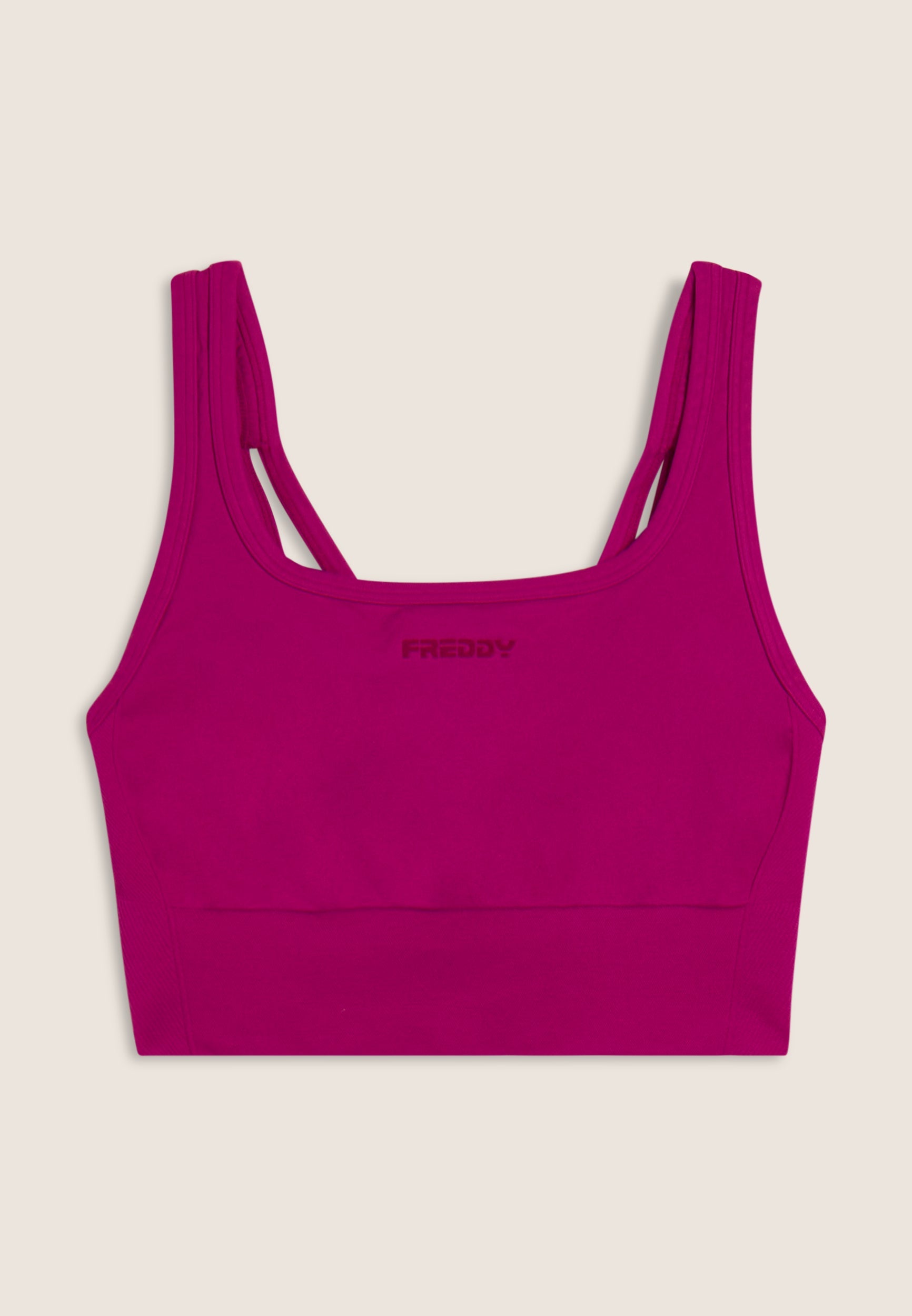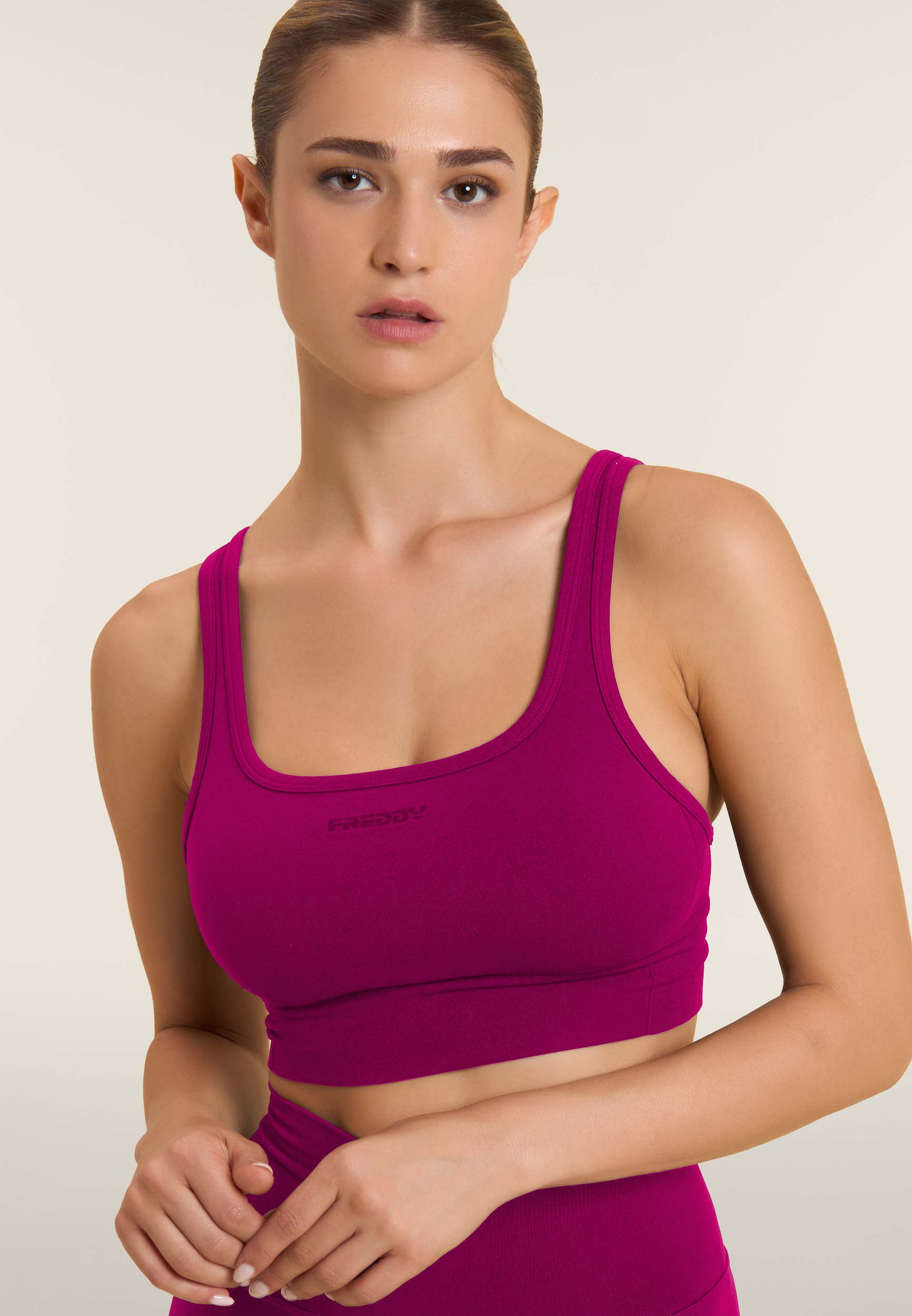 Medium support sports bra with removable moulded cups, ideal for daily training. The cut is designed to offer support and style: round neckline, regular shoulder straps crossed at the back, and side inserts in herringbone textured fabric. The nylon jersey fabric is breathable and durable.