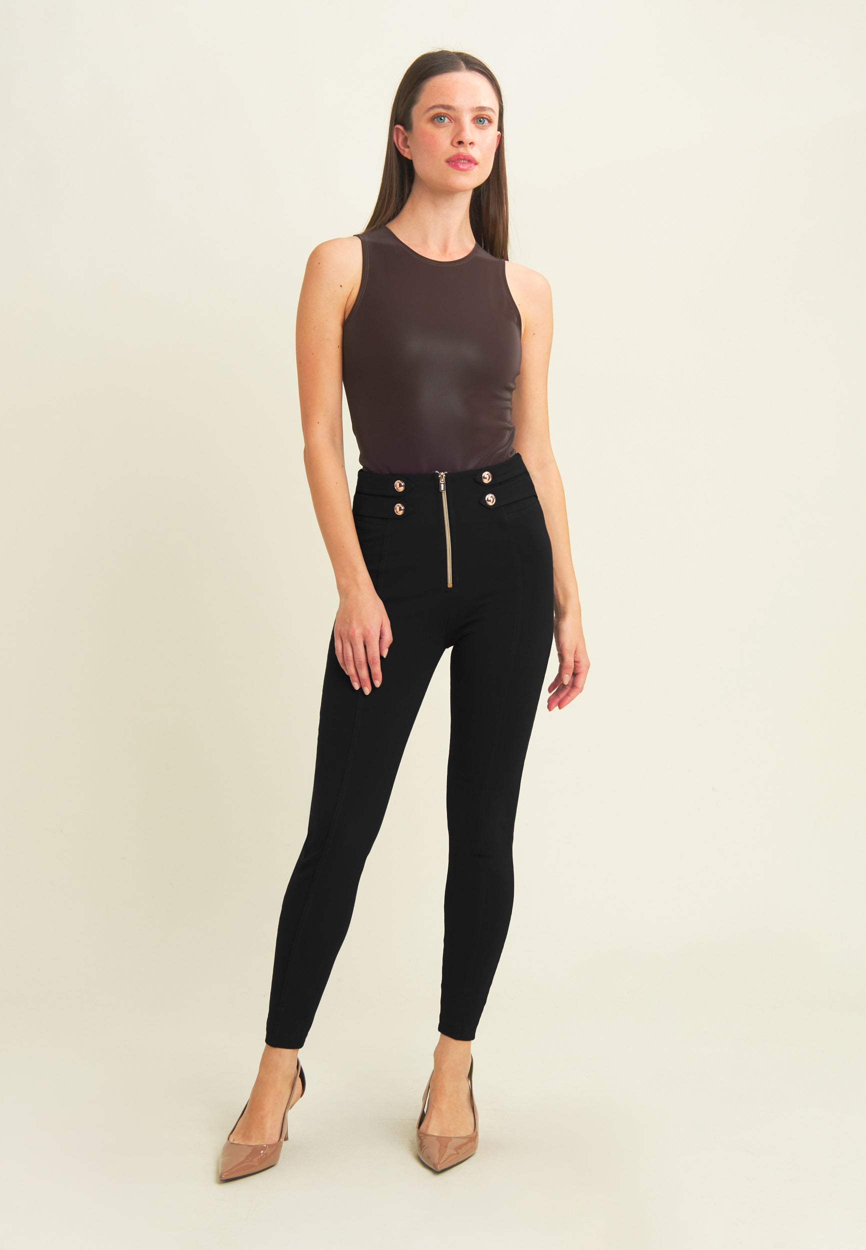 WR.UP® super skinny push-up 7/8 length trousers in heavy organic stretch cotton jersey. The decorative ribbons at the waist, fixed by large gold rivets, and the central stitching along the leg give the garment character and originality. High waist with central zip.