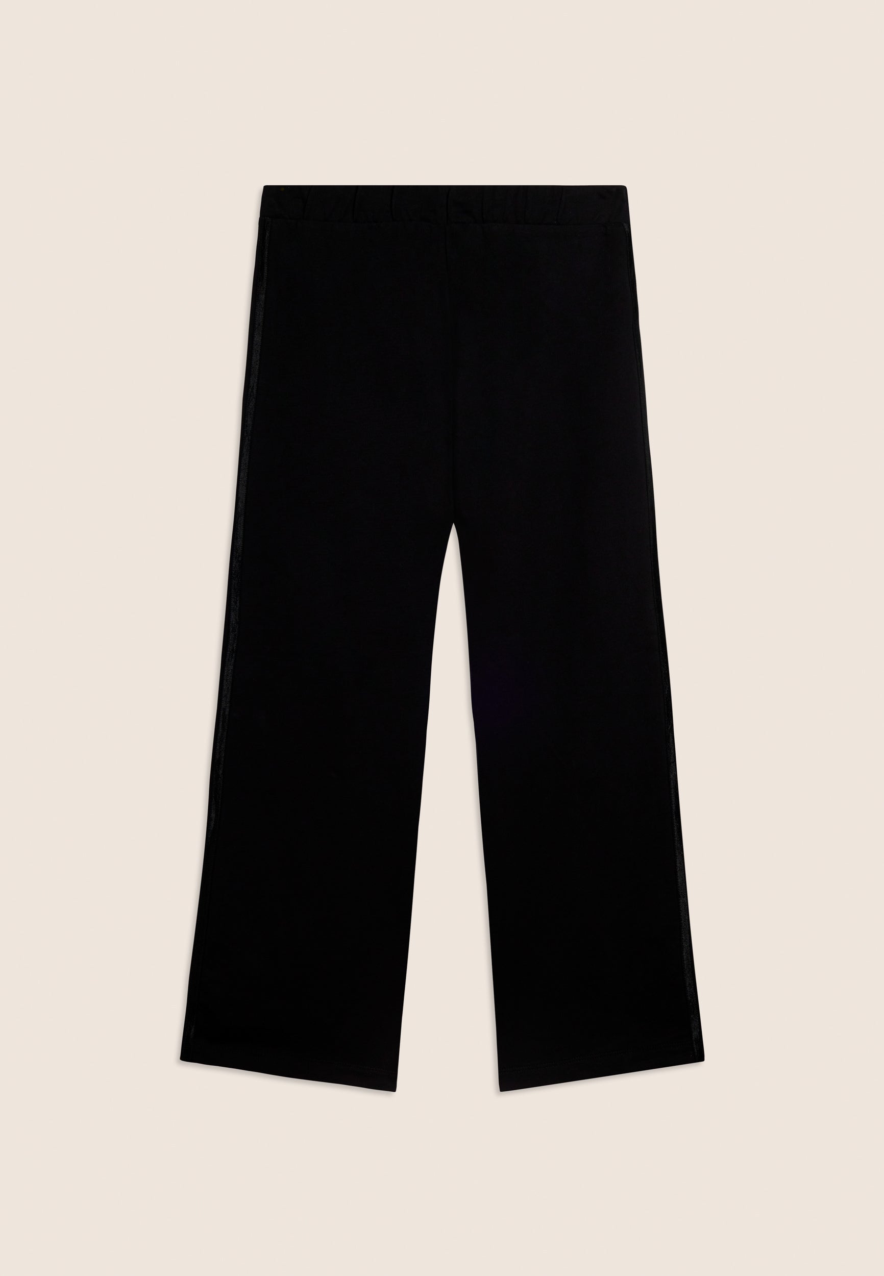 Athletic trousers with comfort fit, wide leg and cropped length, ideal for light activities and relaxing moments. The waist has internal elastic and is adjustable through the drawstring. The FREDDY logo in light pink beads on the heart and the shiny elastic inserts decorating the side seams add a touch of style. Made of heavy cotton stretch jersey, they offer maximum comfort.