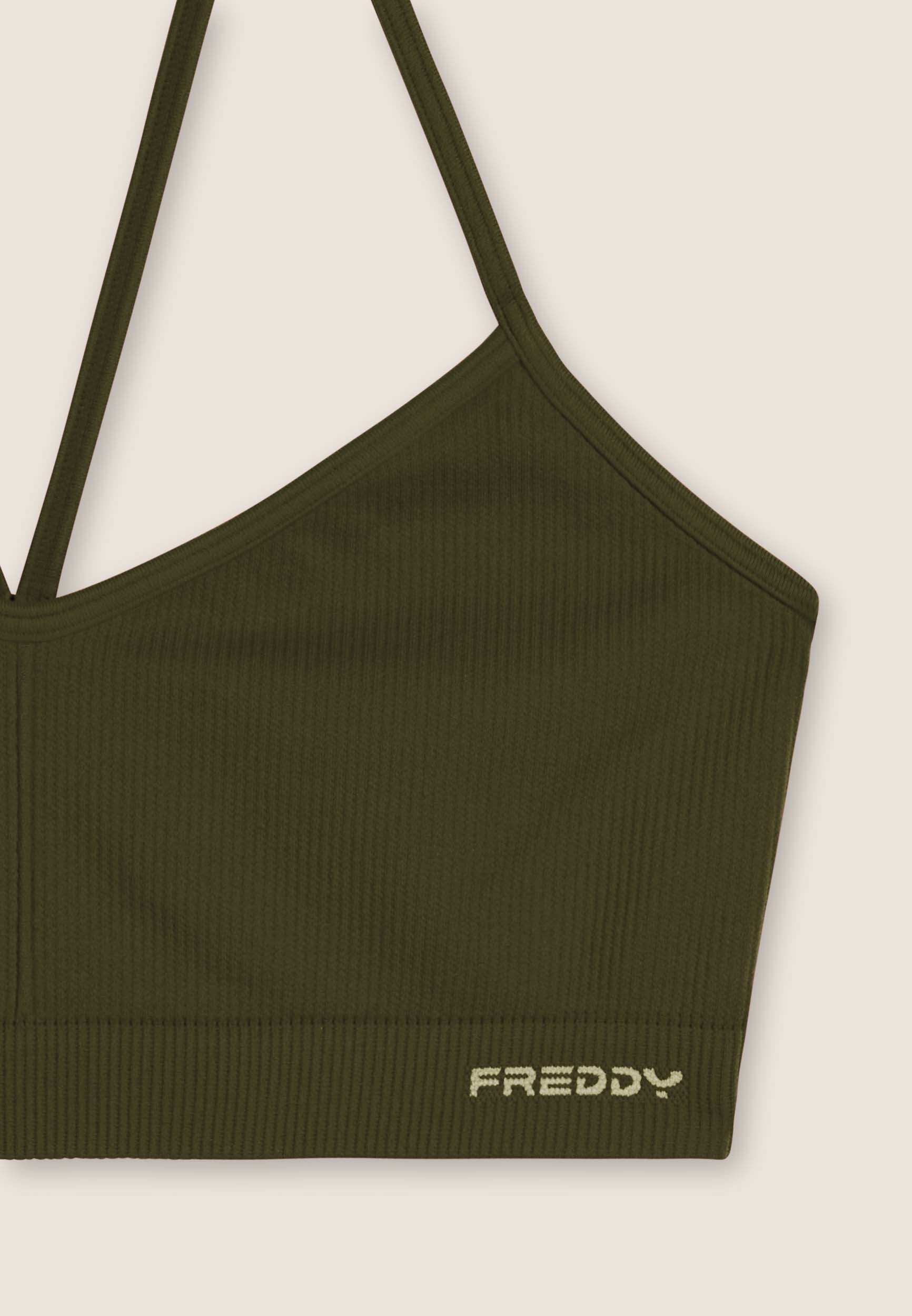 Medium support sports bra, ideal for variable intensity training. Made from seamless ribbed fabric, it seamlessly follows the contours of the body to provide total comfort. The design includes a wide neckline and thin shoulder straps crossed at the back, with a small FREDDY jacquard logo on the underbust band.