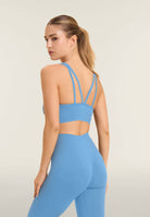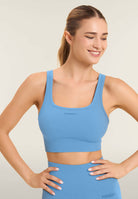 Medium support sports bra with removable moulded cups, ideal for daily training. The cut is designed to offer support and style: round neckline, regular shoulder straps crossed at the back, and side inserts in herringbone textured fabric. The nylon jersey fabric is breathable and durable.