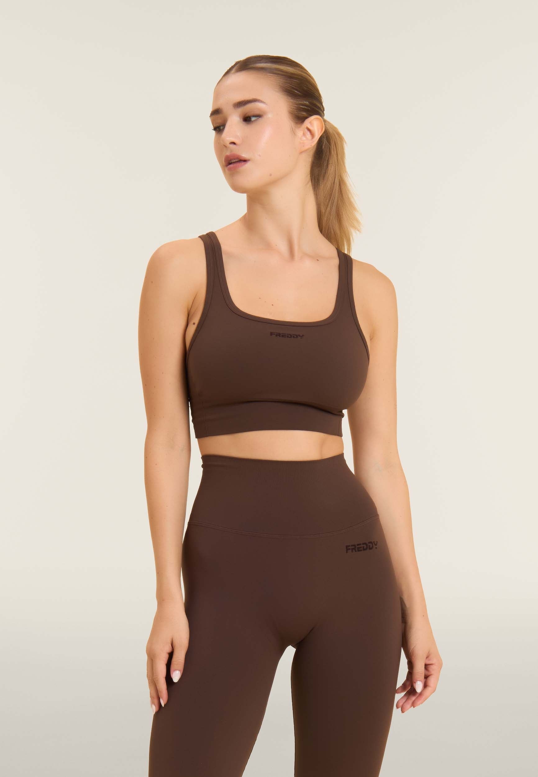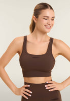 Medium support sports bra with removable moulded cups, ideal for daily training. The cut is designed to offer support and style: round neckline, regular shoulder straps crossed at the back, and side inserts in herringbone textured fabric. The nylon jersey fabric is breathable and durable.