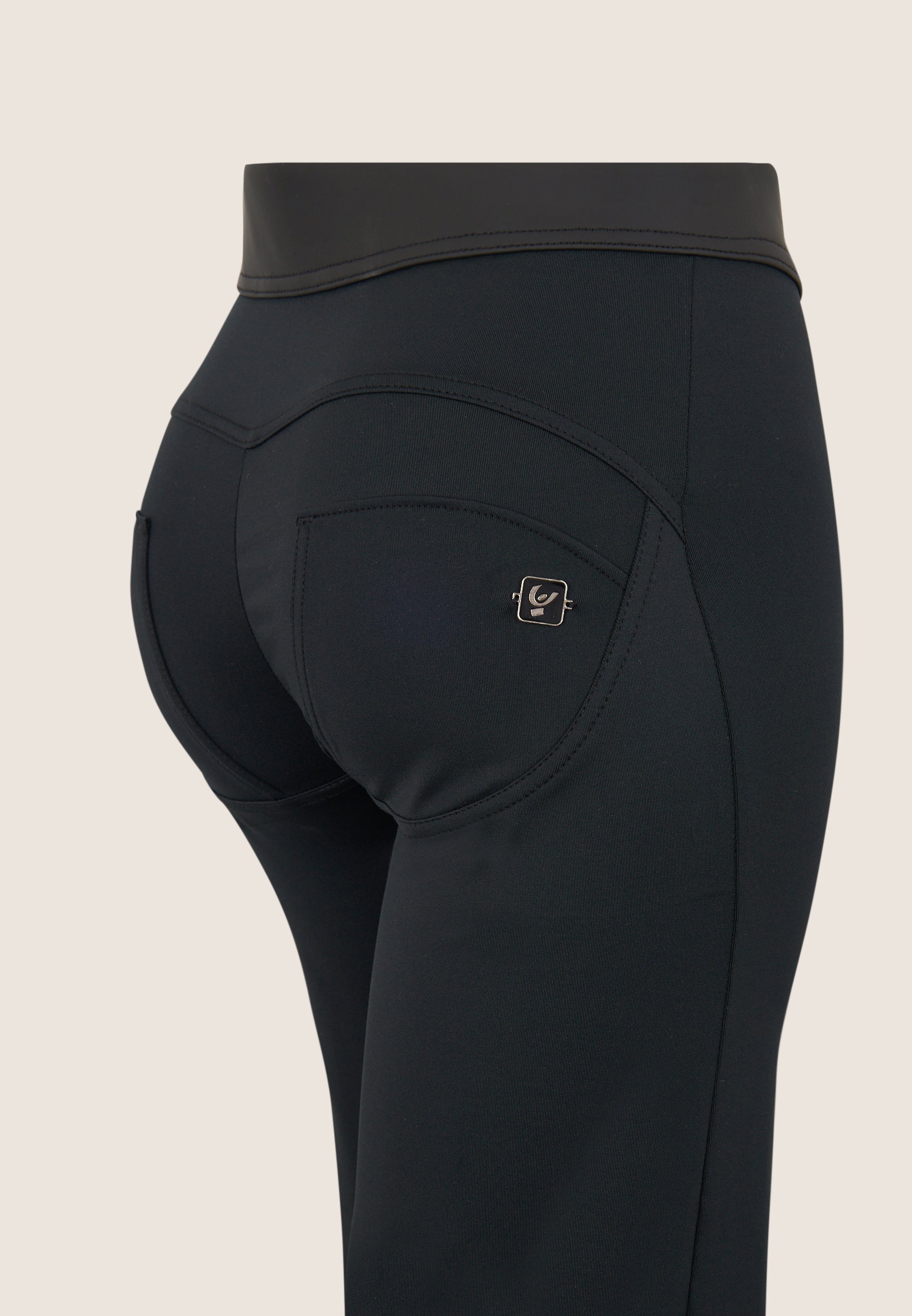 WR.UP® wide leg push-up trousers in breathable D.I.W.O.® performance fabric patented by Freddy, with coated treatment that gives an elegant leather effect on the front and on the waistband. The central seams slim the figure. Regular waist with two-buttons and a zip fastening.