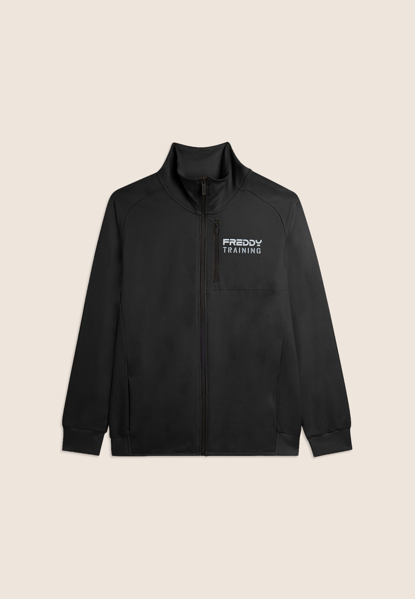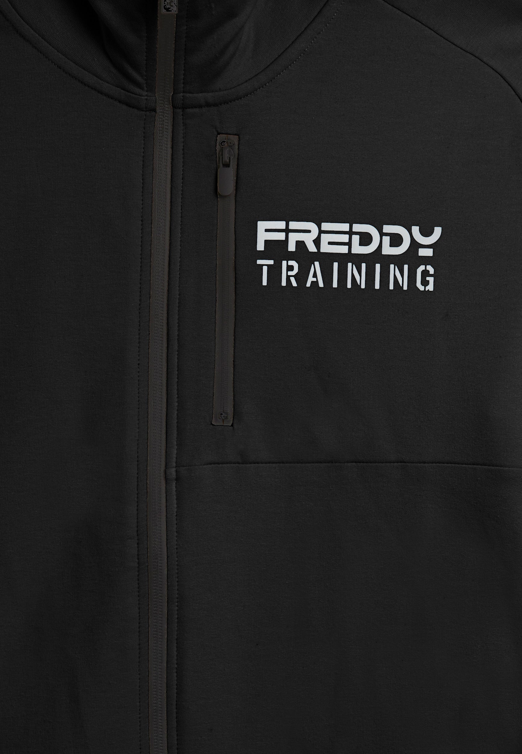 Regular-fit full-zip sweatshirt, perfect for outdoor activities and leisure time. It features a high neck with a ribbed interior, a straight front hem and a ribbed band at the back for a balanced fit. Long sleeves with ribbed cuffs ensure comfortable movement. The innovatively designed shoulder seams provide a dynamic touch. The rubberised 'FREDDY TRAINING' print on the heart adds personality to the garment. The front besom pockets are positioned along the seams for aesthetic cleanliness, and the zipped breast pocket offers extra practicality. Made of baby French Terry.