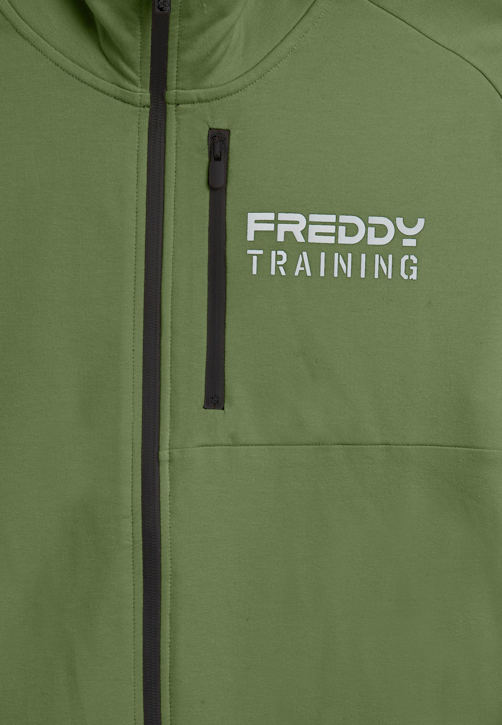 Regular-fit full-zip sweatshirt, perfect for outdoor activities and leisure time. It features a high neck with a ribbed interior, a straight front hem and a ribbed band at the back for a balanced fit. Long sleeves with ribbed cuffs ensure comfortable movement. The innovatively designed shoulder seams provide a dynamic touch. The rubberised 'FREDDY TRAINING' print on the heart adds personality to the garment. The front besom pockets are positioned along the seams for aesthetic cleanliness, and the zipped breast pocket offers extra practicality. Made of baby French Terry.