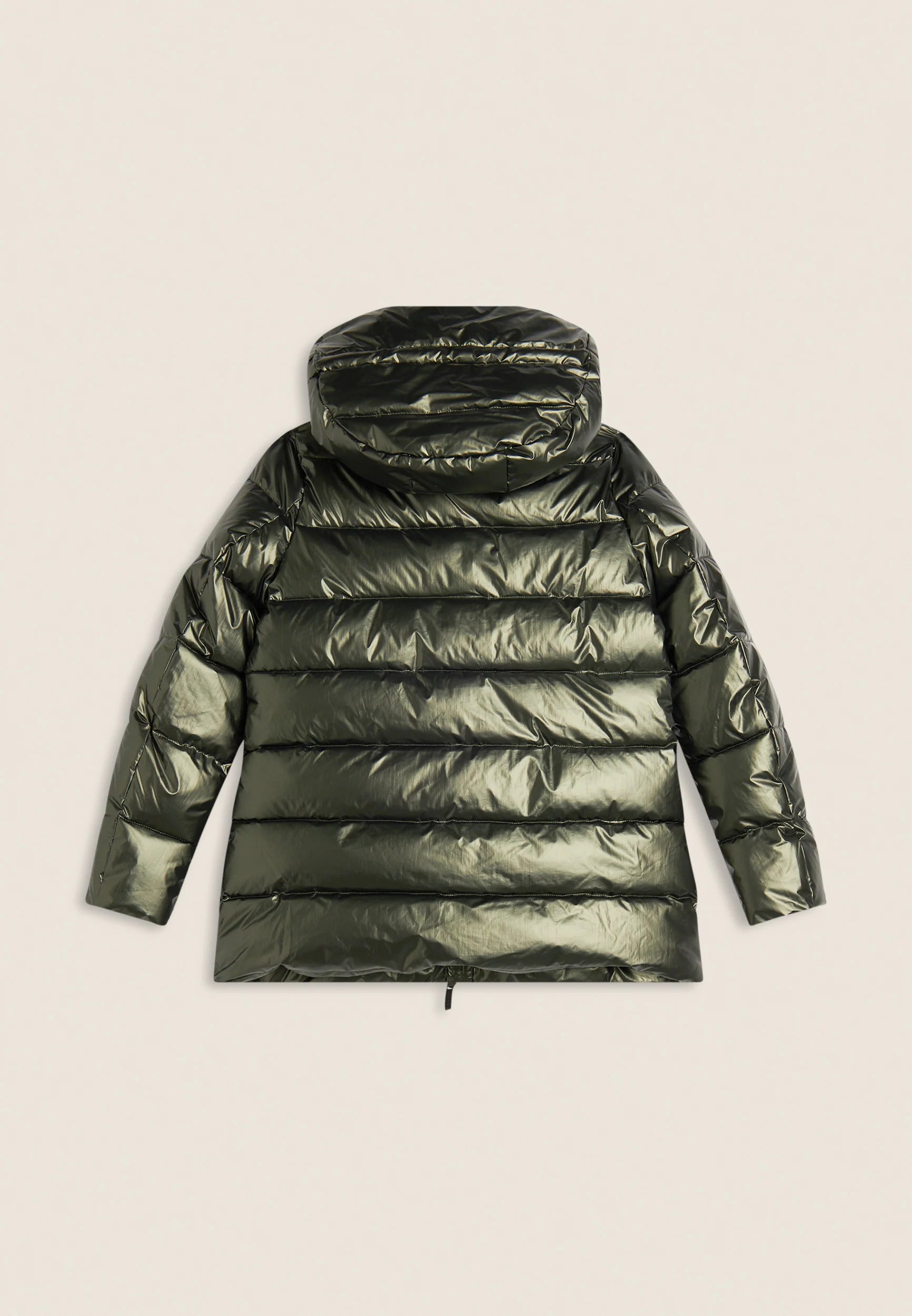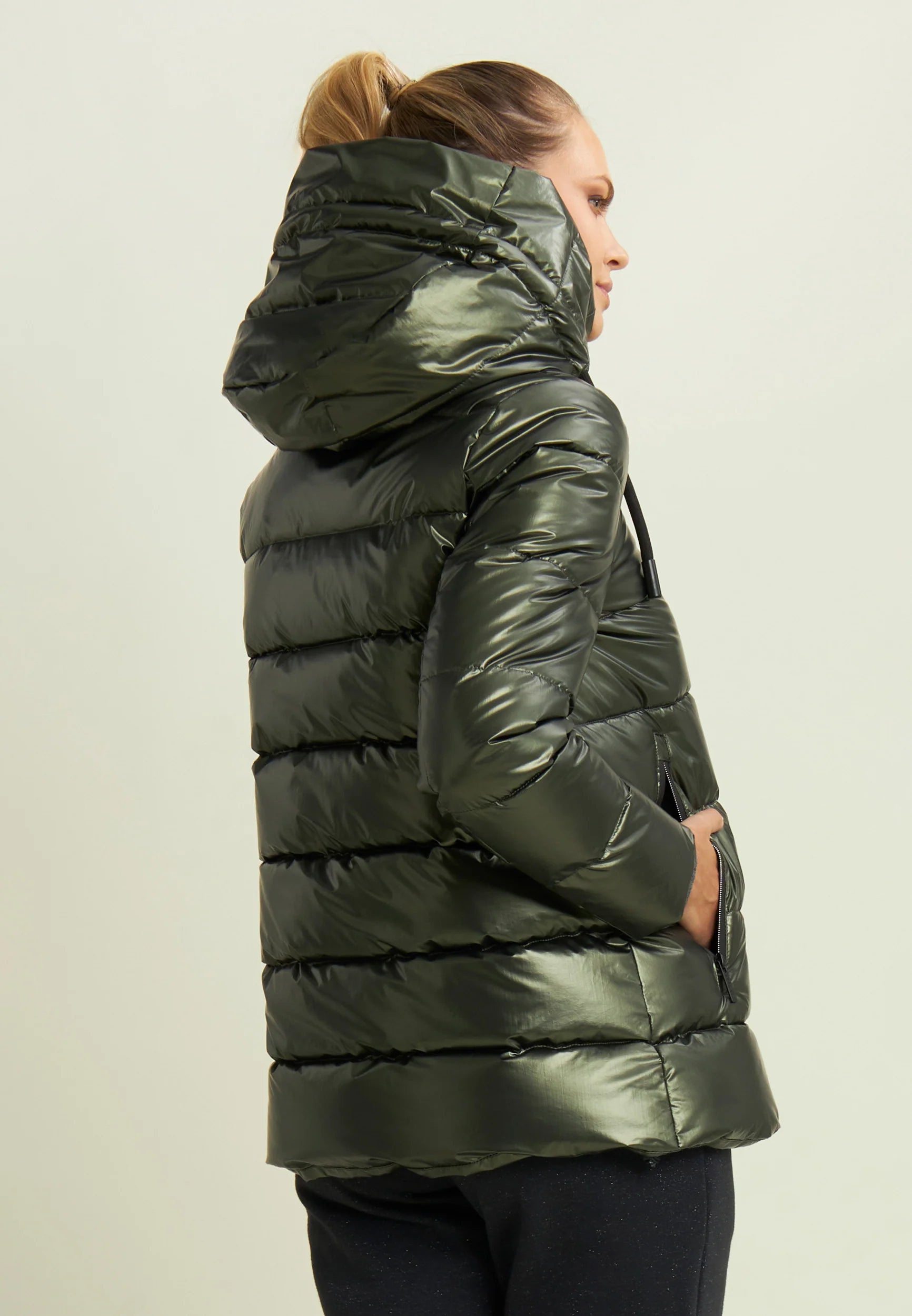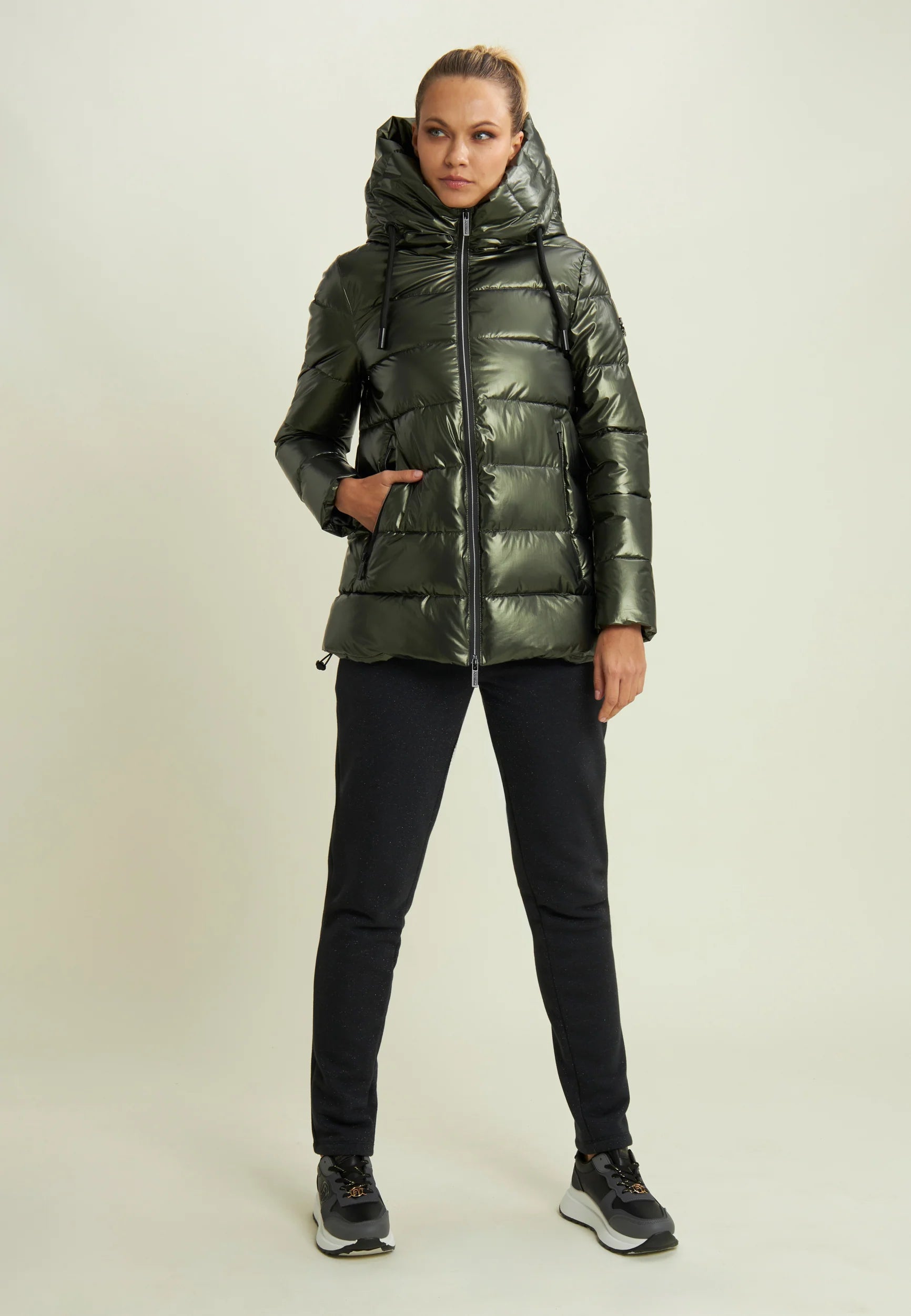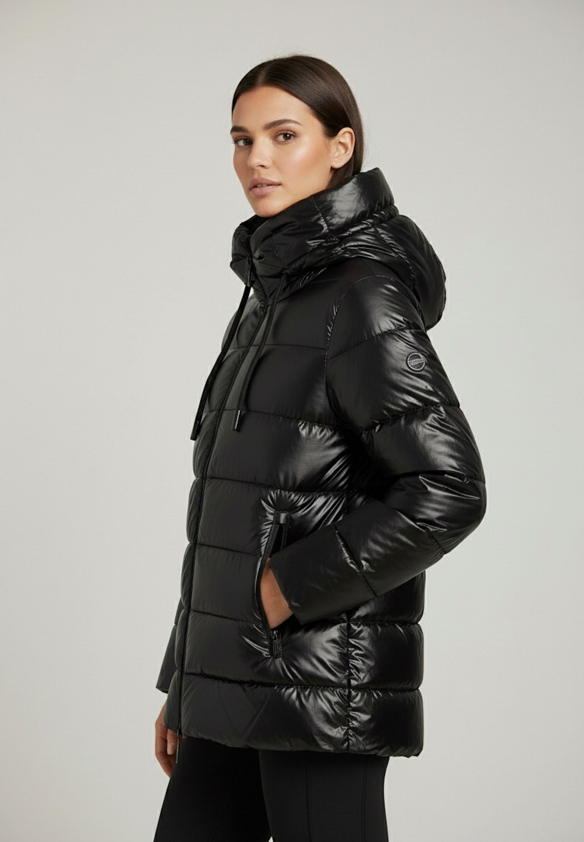 Women's glossy down jacket with protective hood and drawstring