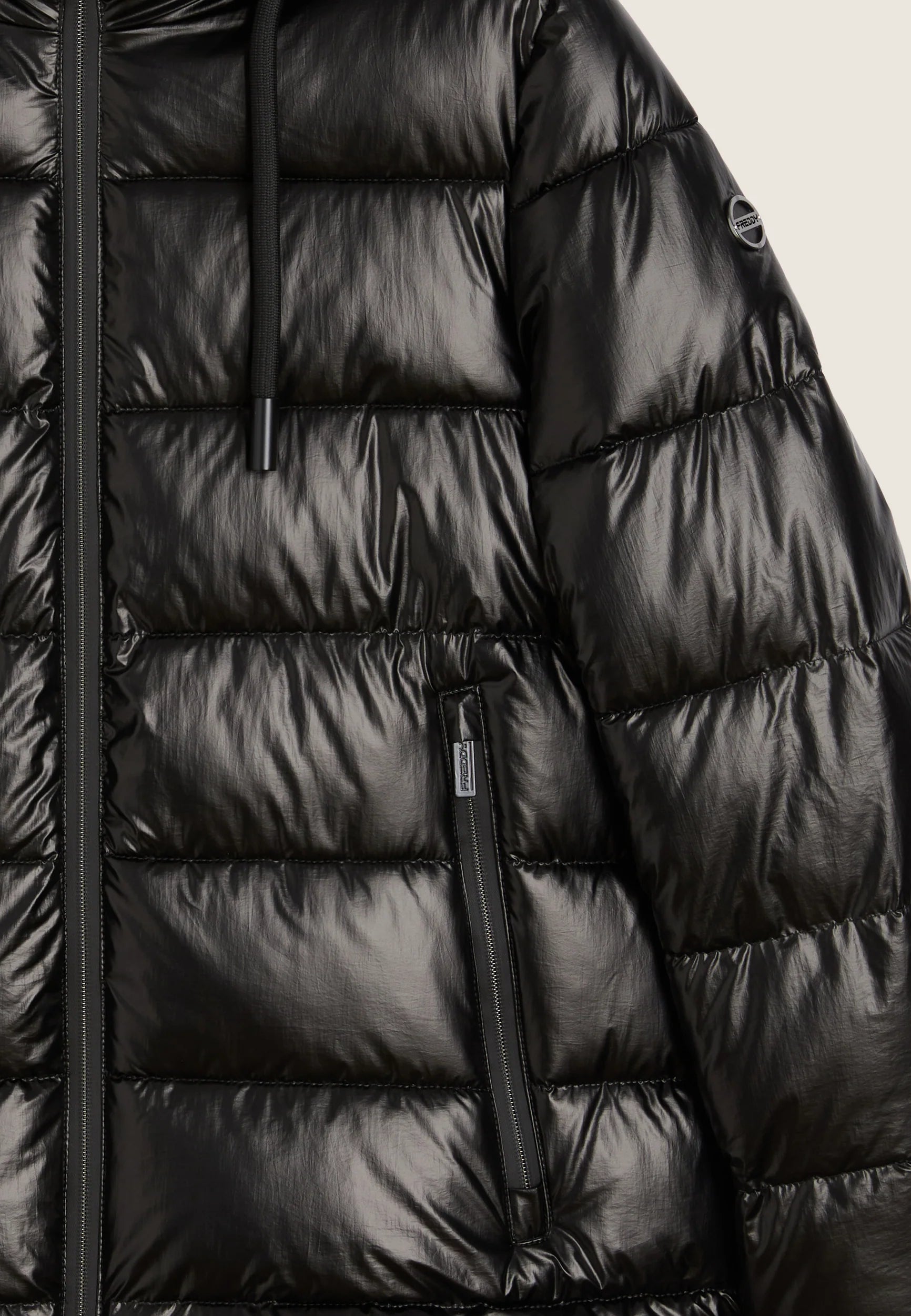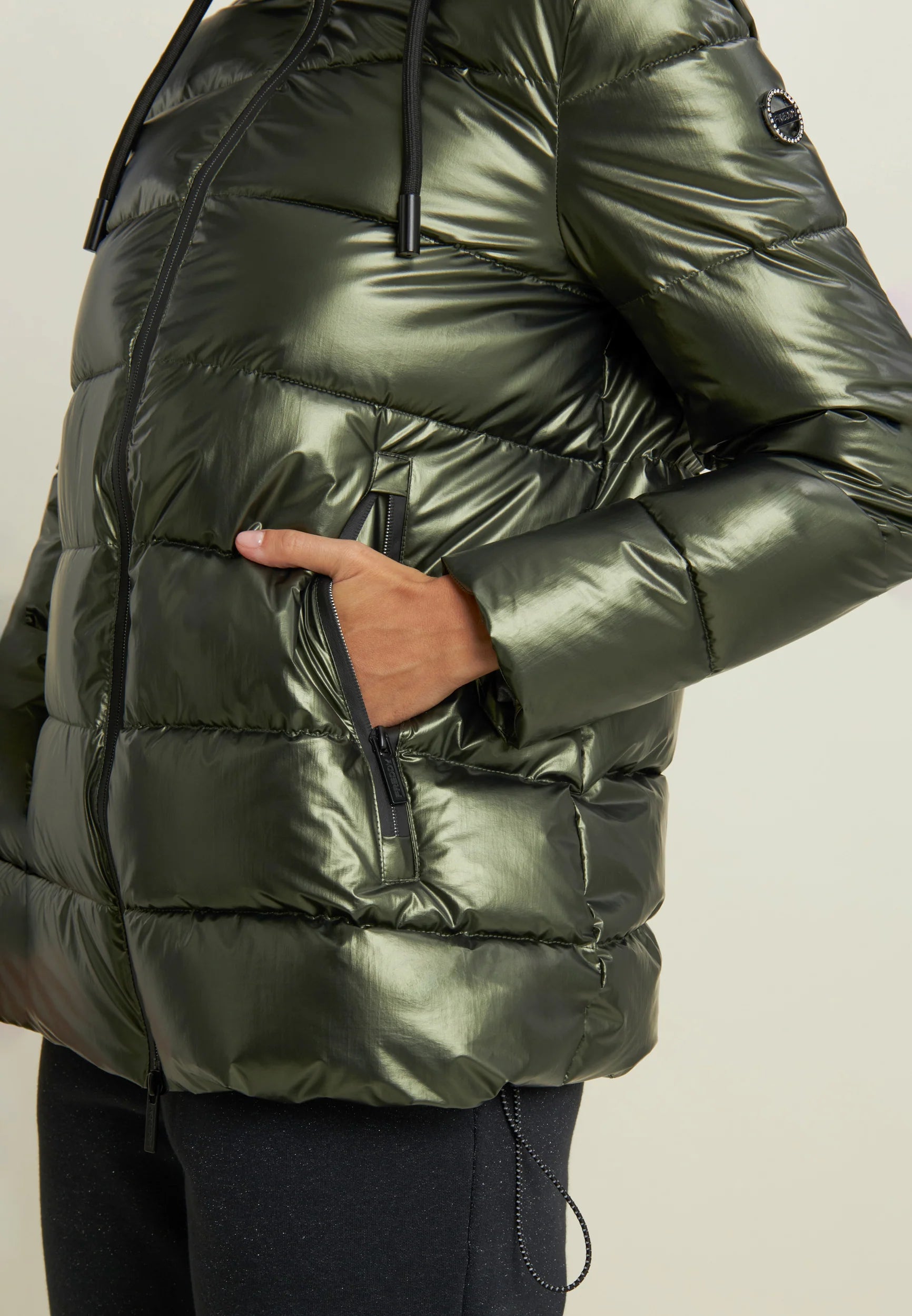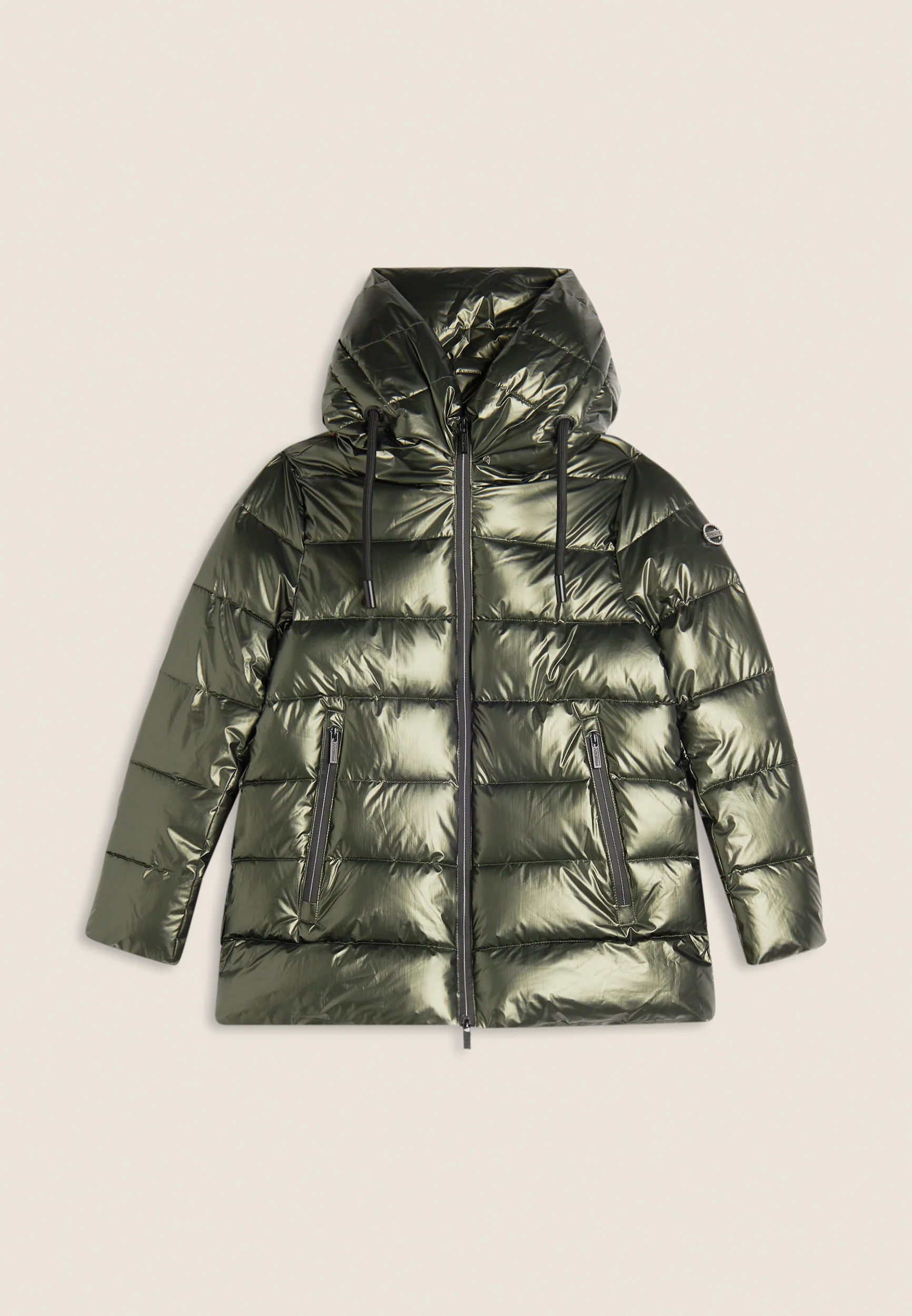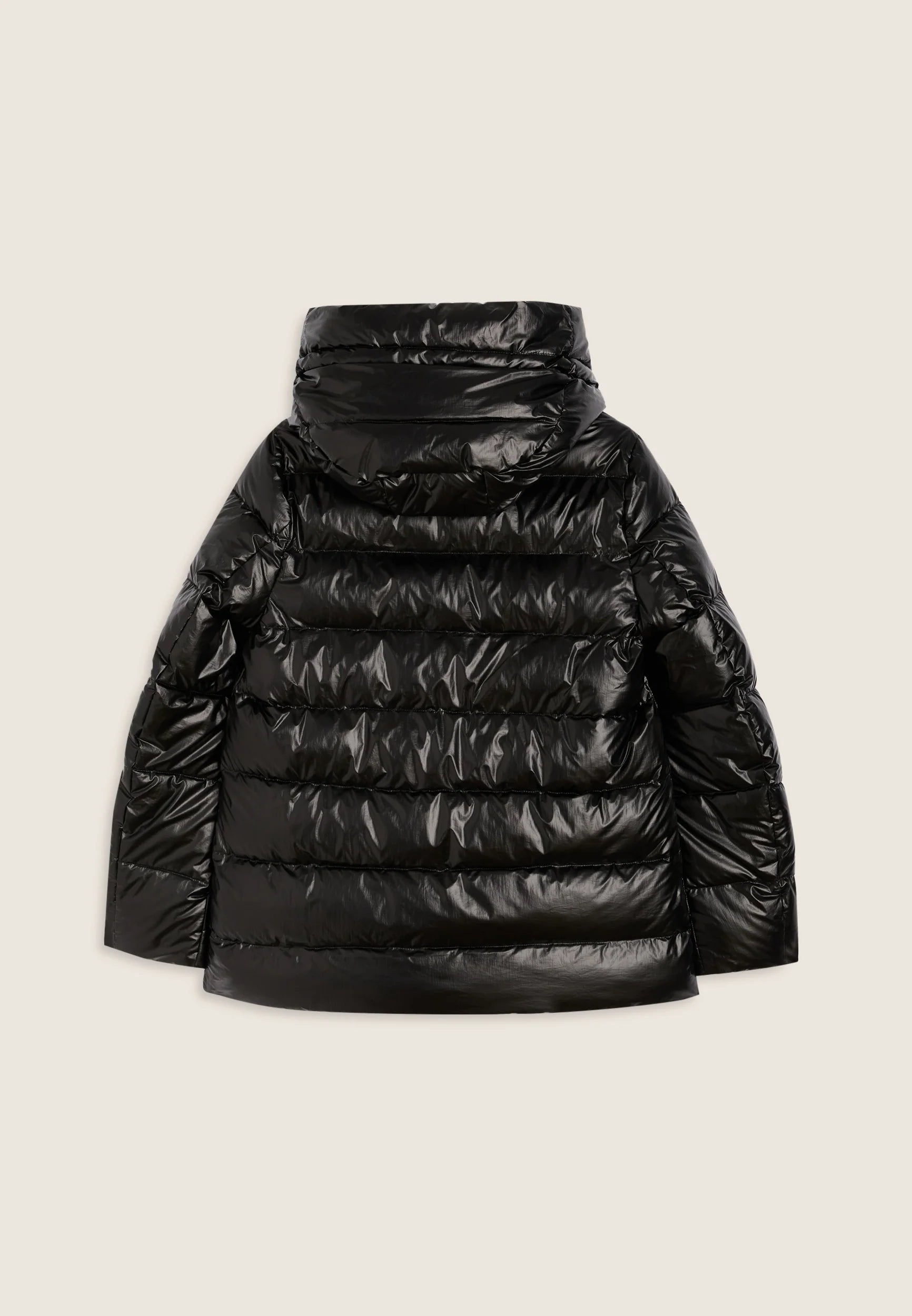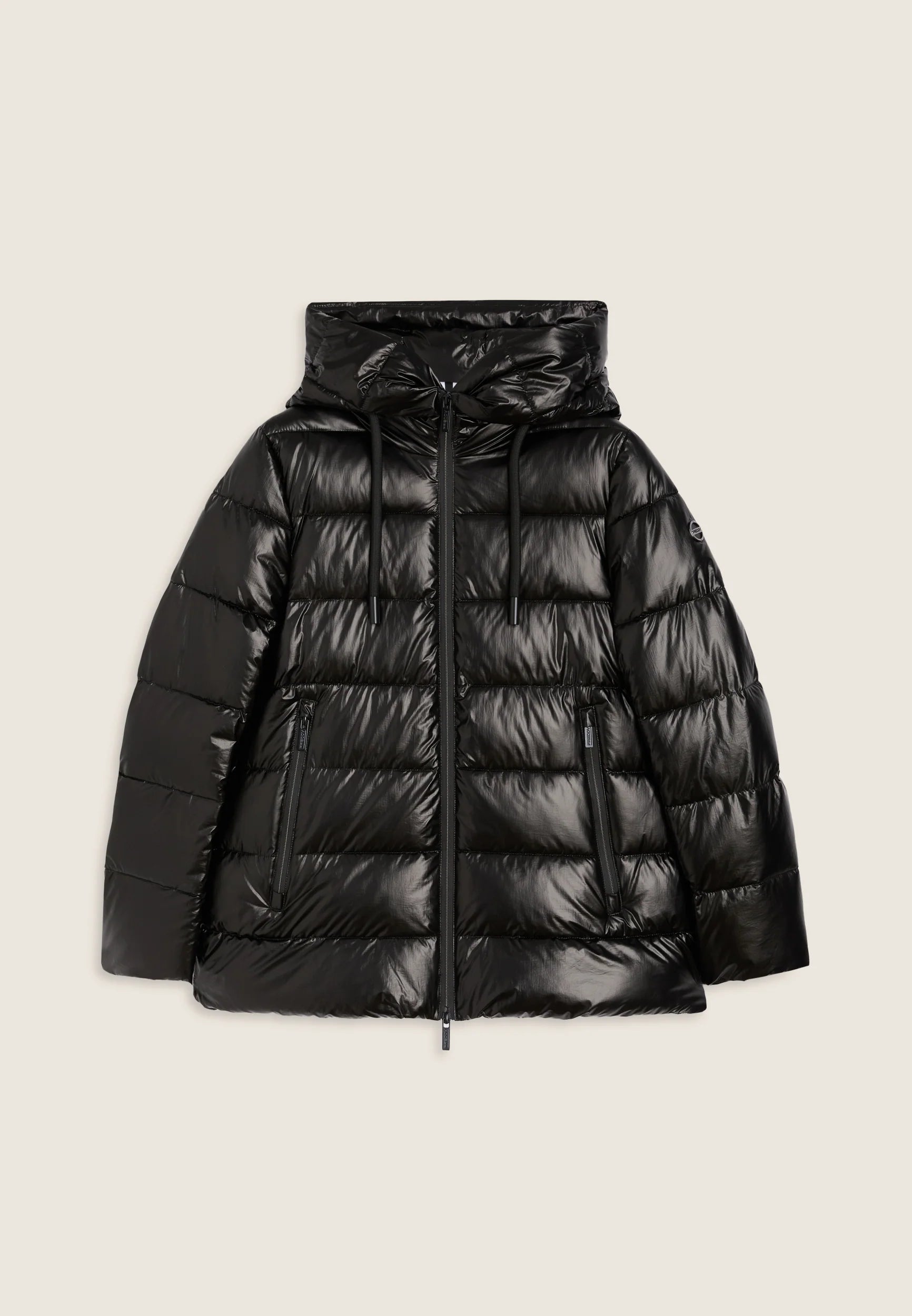 Women's glossy down jacket with protective hood and drawstring