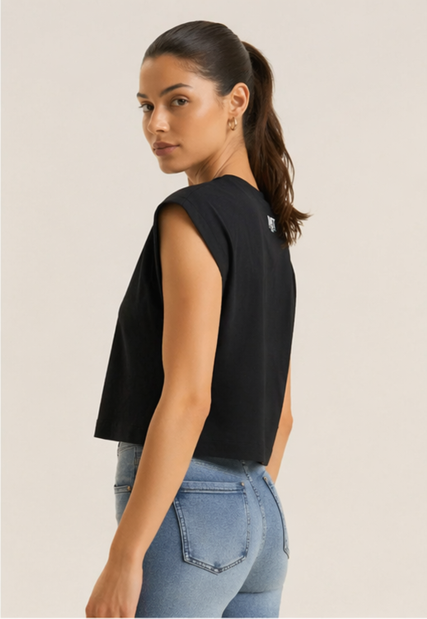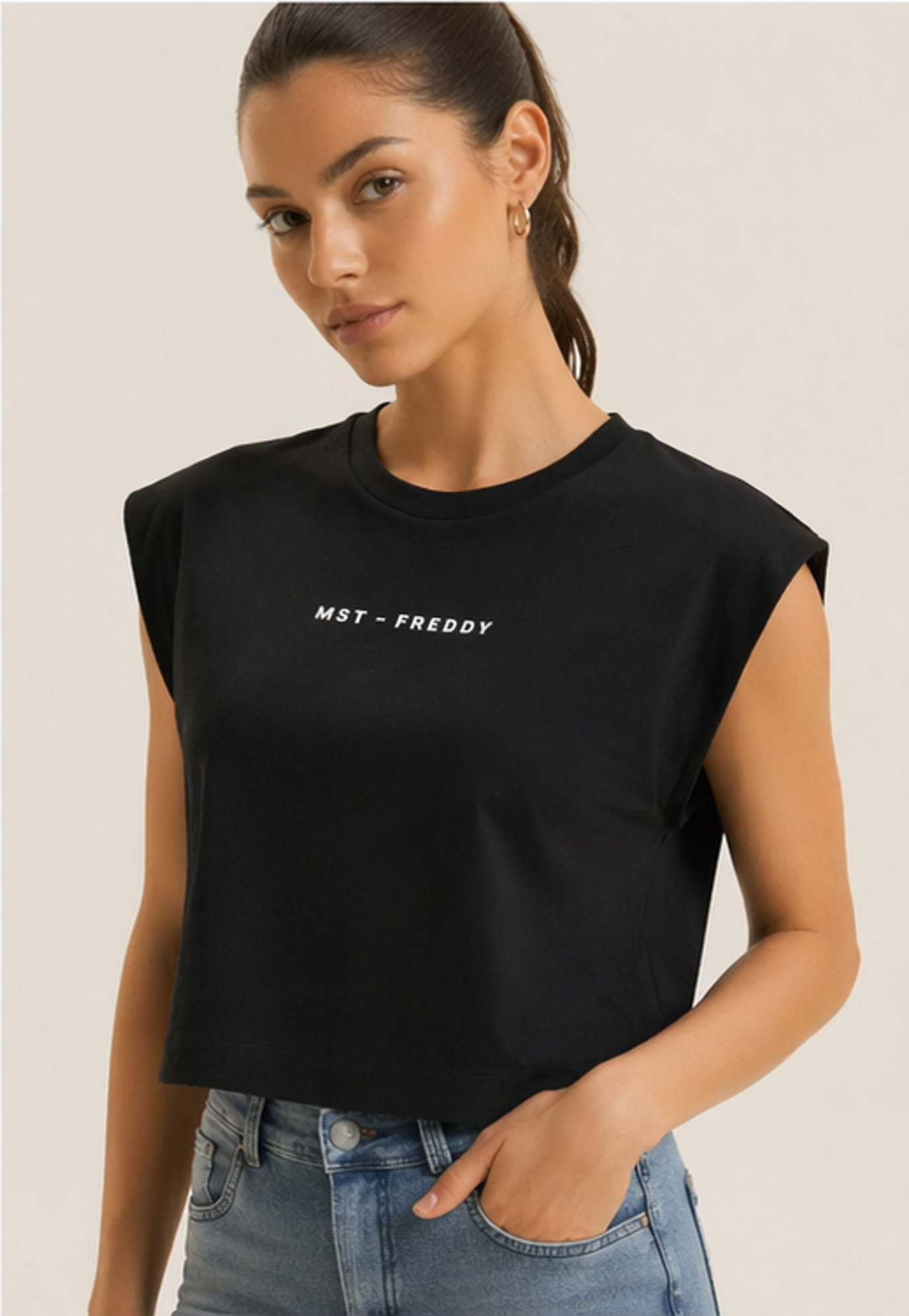 Short sleeve t-shirt with comfortable fit and cropped length, made of stretch cotton jersey, which guarantees a soft and comfortable fit. The straight bottom and very short cap sleeves create a casual yet sophisticated look. Small MST FREDDY prints on the chest and under the back neckline add a distinctive touch. A versatile garment, ideal for a simple yet elegant look, perfectly suited to both leisure and sporty outfits.