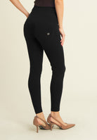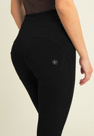 WR.UP® super skinny push-up 7/8 length trousers in heavy organic stretch cotton jersey. The decorative ribbons at the waist, fixed by large gold rivets, and the central stitching along the leg give the garment character and originality. High waist with central zip.