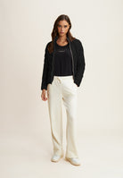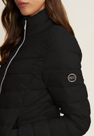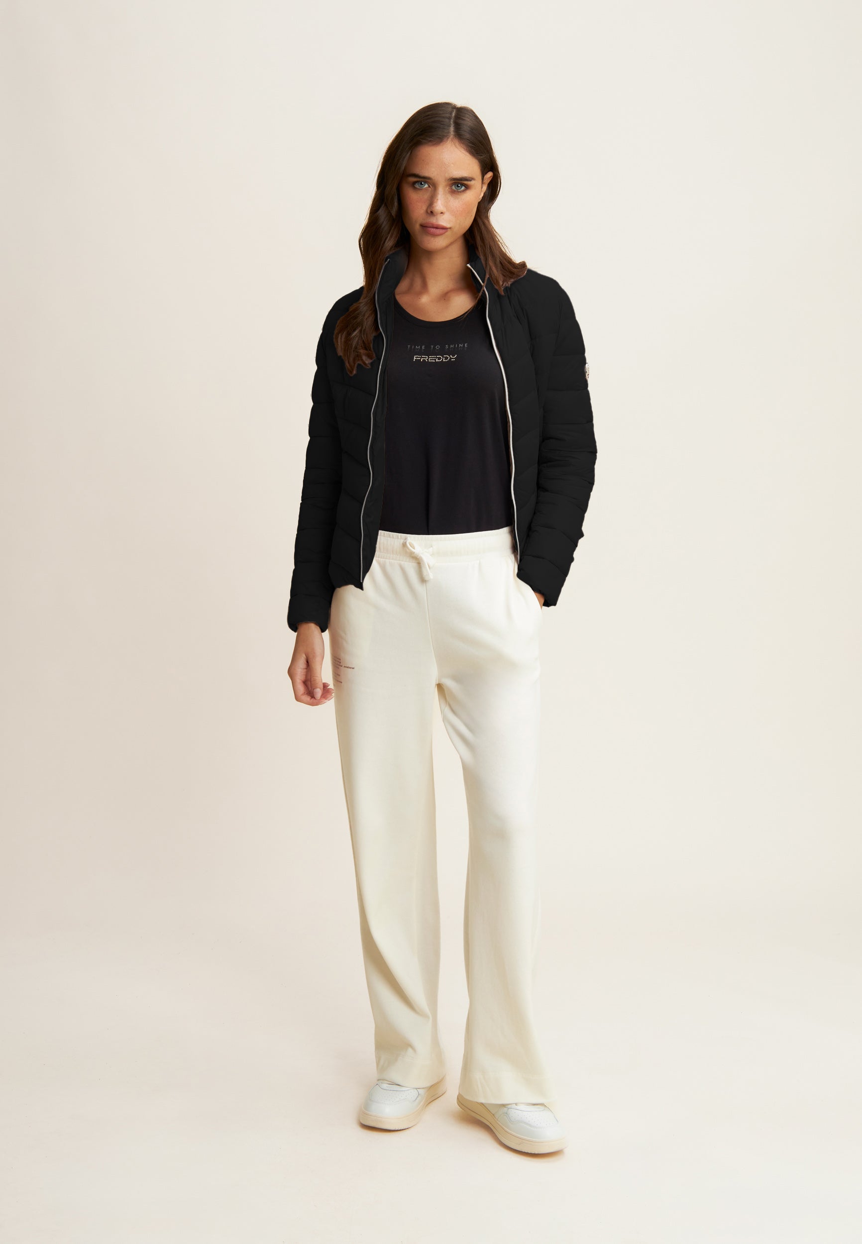 Women's regular fit down jacket with horizontal bands and length just below the waist, perfect for tackling the colder days. The turtleneck and full double-slide zip fastening provide optimal protection from the cold. The adjustable drawstring waist allows for a customised fit. Glossy nylon exterior with water repellent treatment and animal-friendly fake-down quilting, warm and effective even in wet conditions. Feminine details such as the rhinestone logo on the left sleeve and practical front zipped pockets complete the look.
