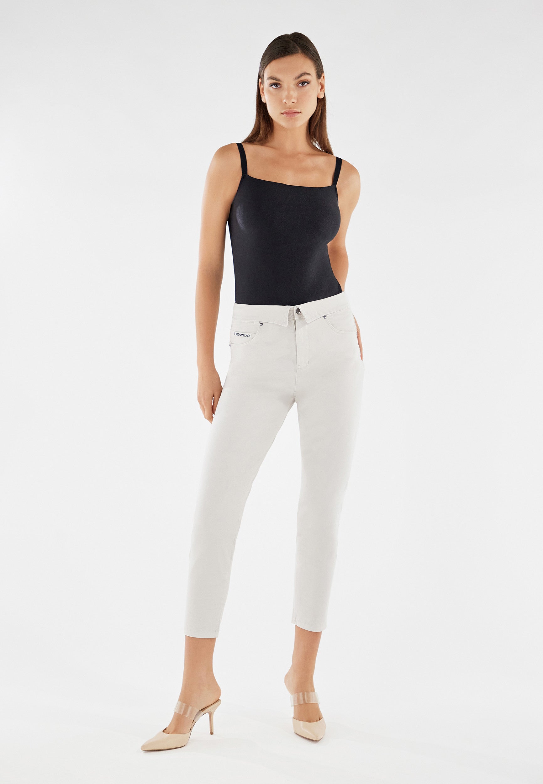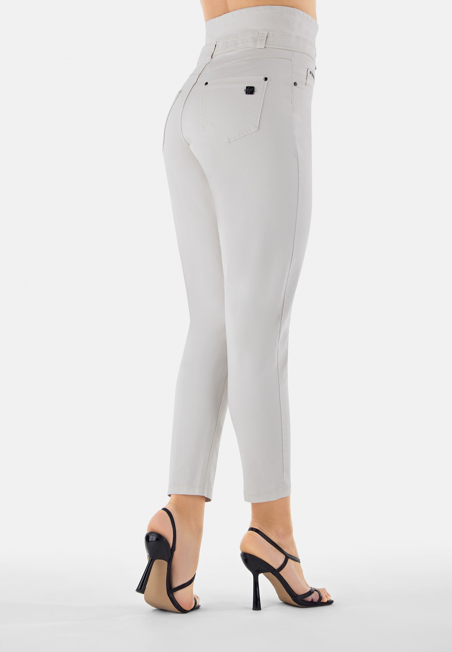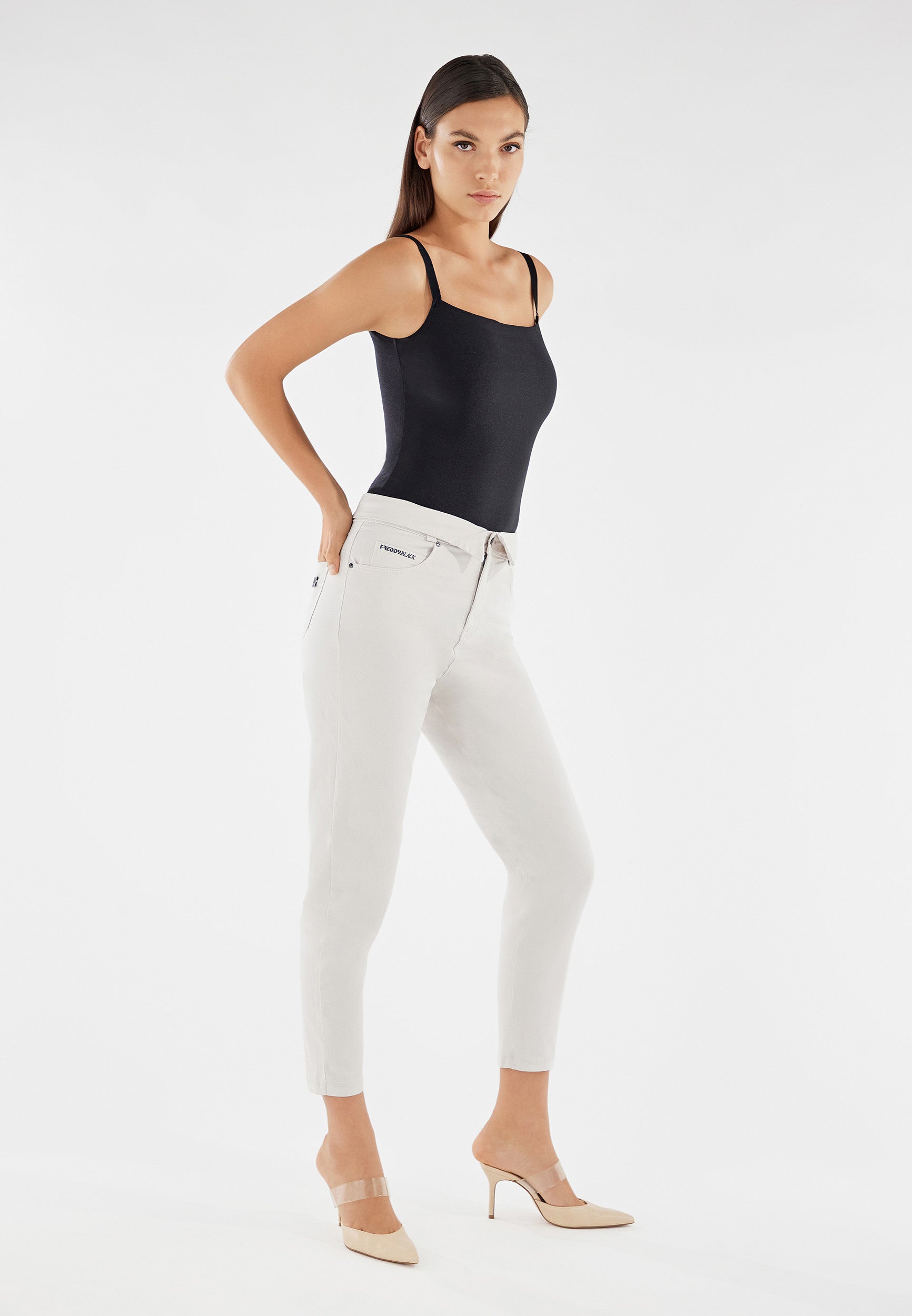 Experience the unique fit and feel of the Fit Jeans Pants in Beige. They feature a sleek skinny fit that hugs your curves. Adding to that is a modern 7/8 length that subtly highlights your ankles. The look is completed by a flattering high waist that offers gentle support. Crafted designed with a stretch denim-effect material for authentic style and easy movement. Perfect for countless occasions, from casual to chic.