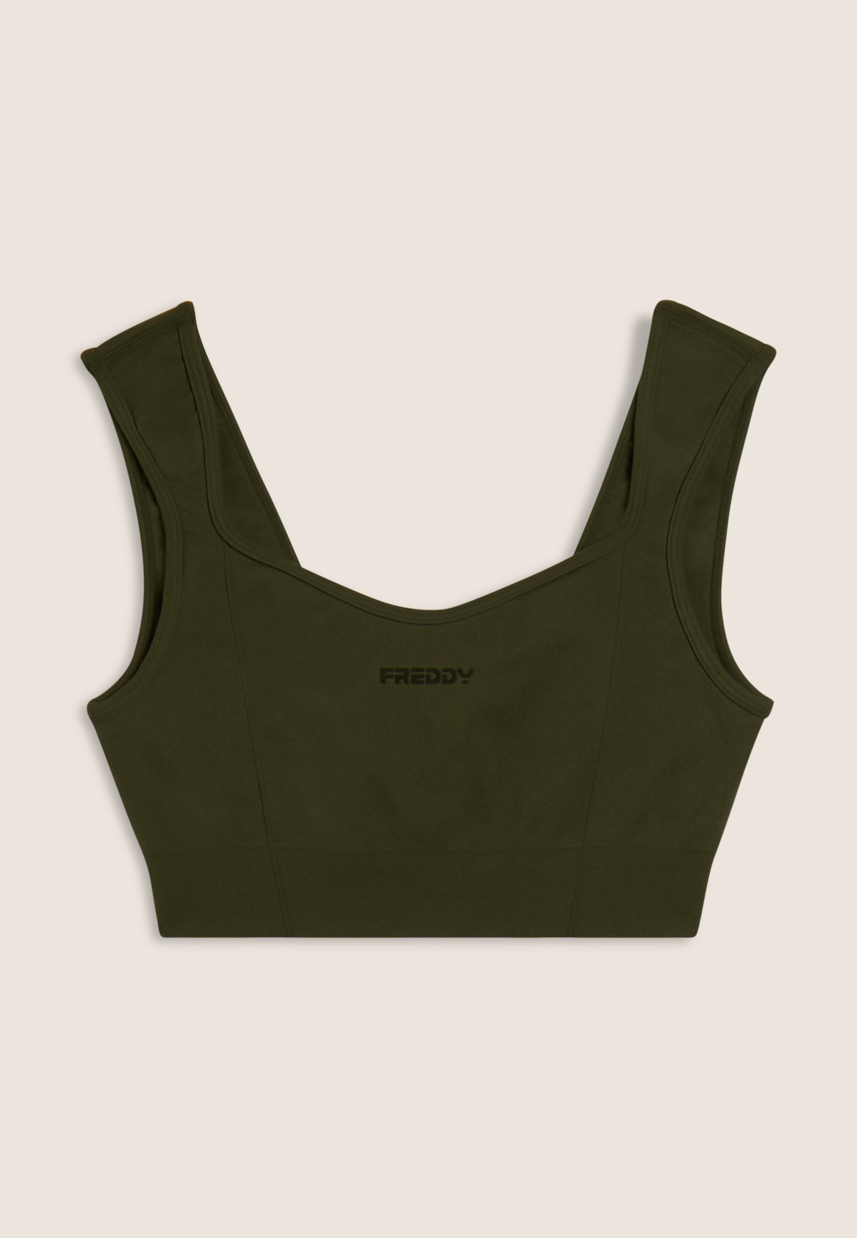 With its feminine and comfortable design, this light support sports top is perfect for yoga and low intensity activities. Sweetheart neckline at the front and square neckline at the back with regular shoulder straps. The nylon jersey performance fabric is soft, breathable and lightweight, with a small FREDDY contrasting logo on the front.
