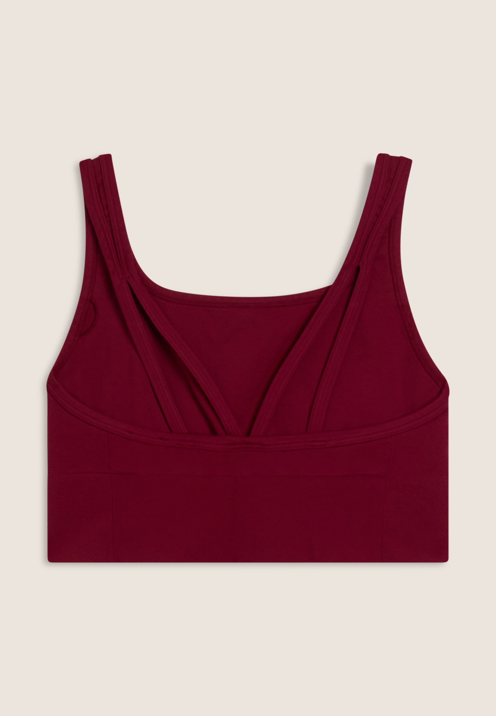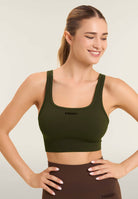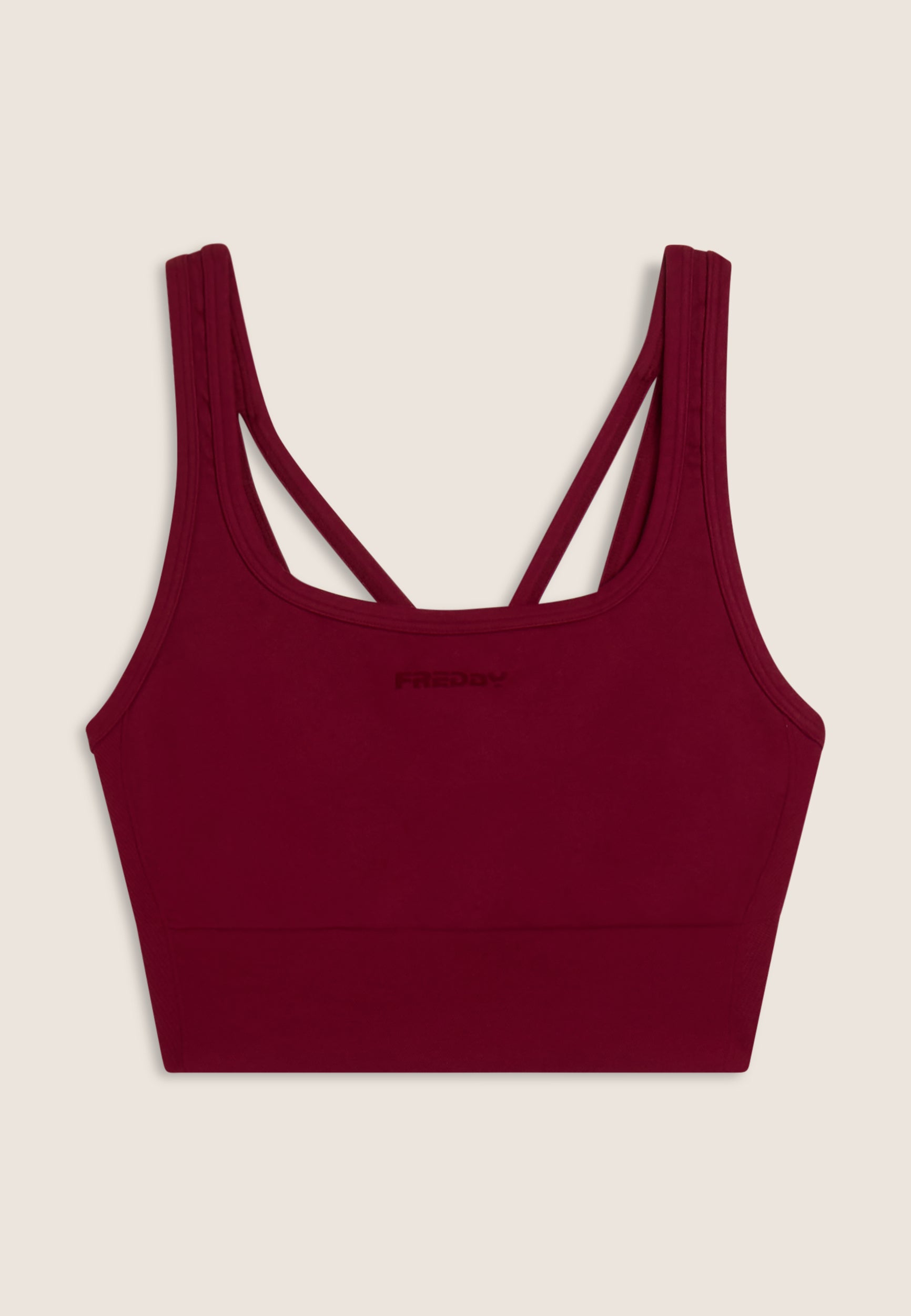Medium support sports bra with removable moulded cups, ideal for daily training. The cut is designed to offer support and style: round neckline, regular shoulder straps crossed at the back, and side inserts in herringbone textured fabric. The nylon jersey fabric is breathable and durable.
