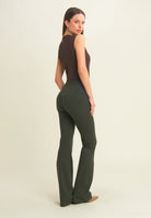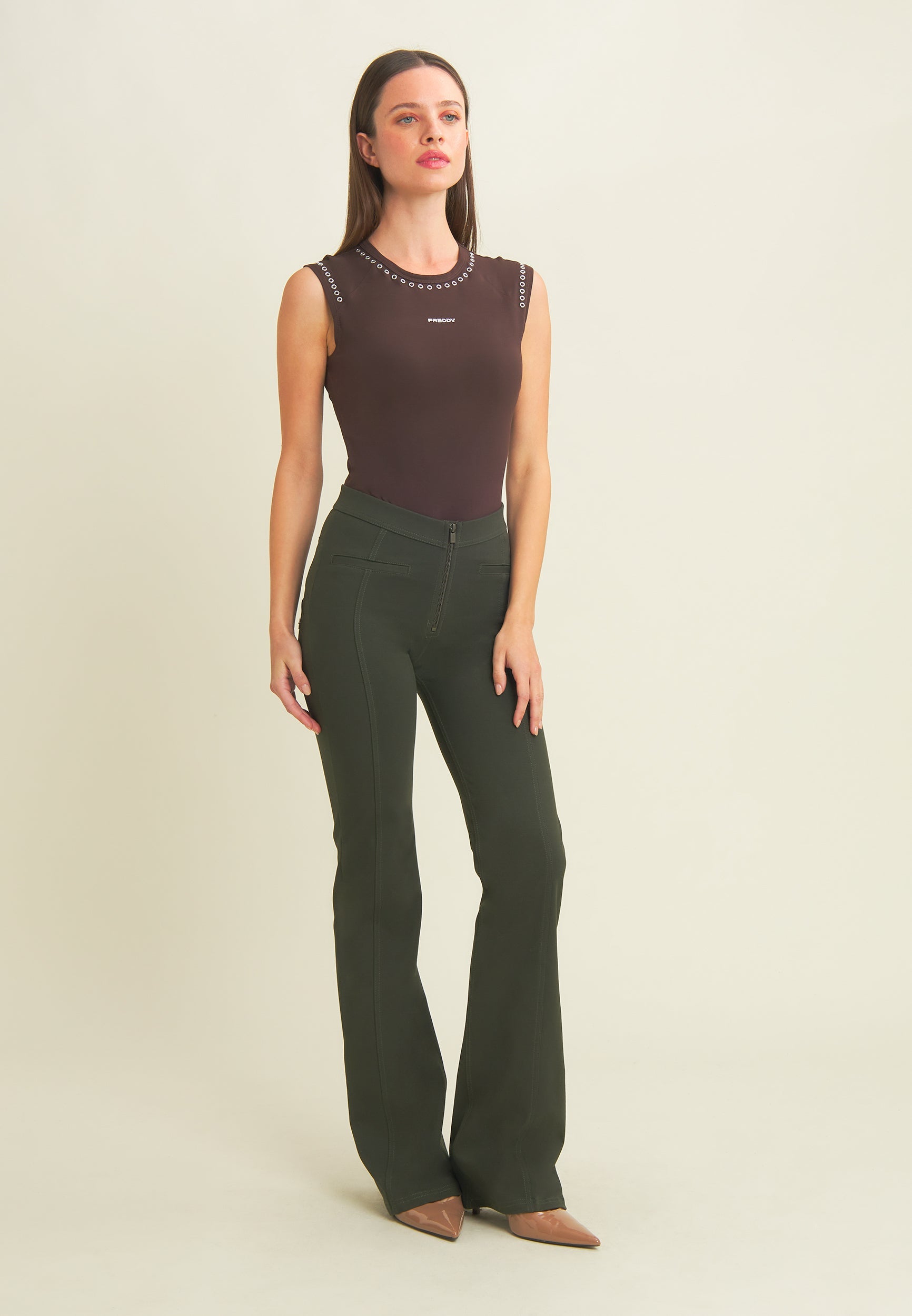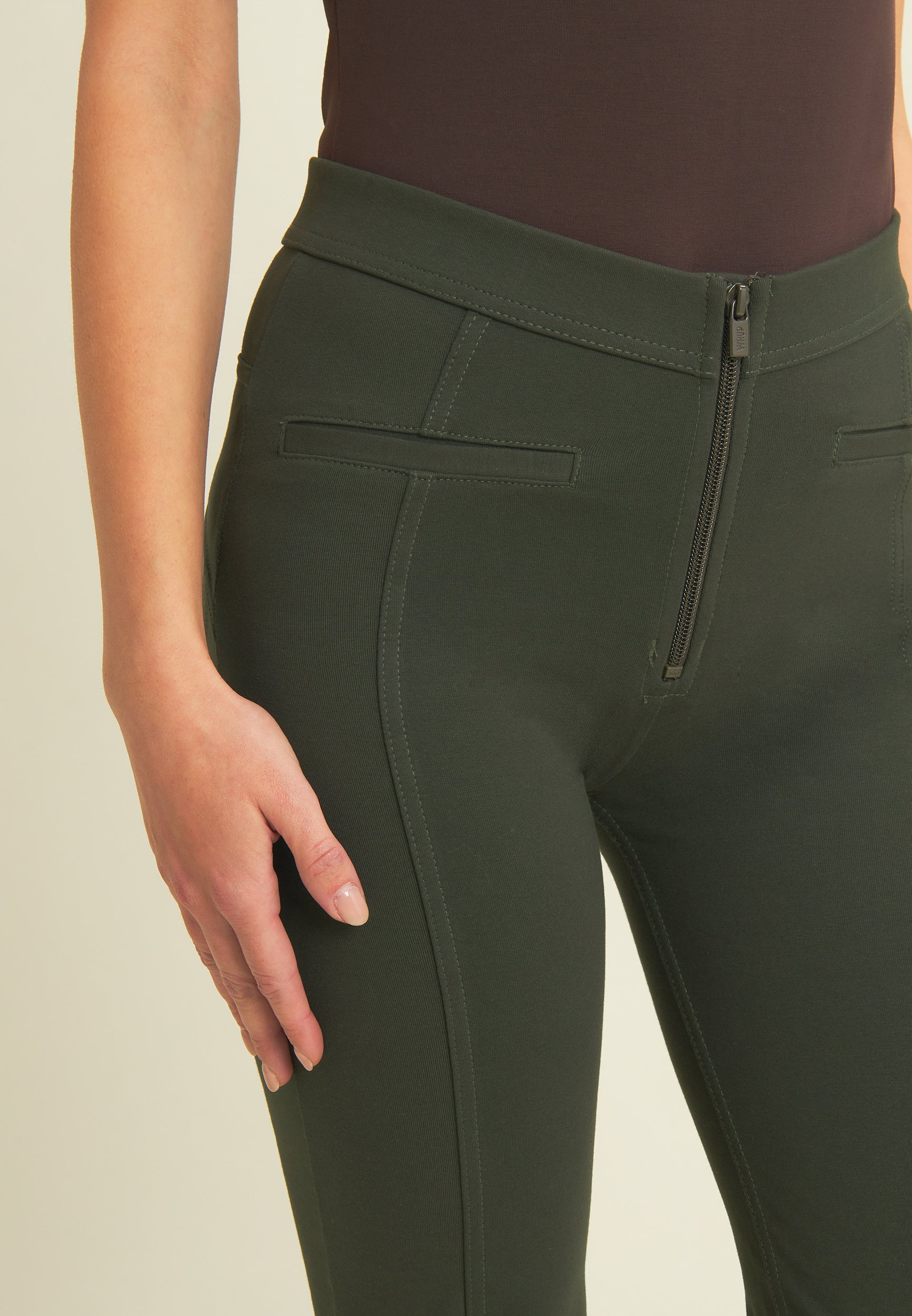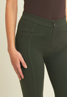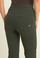 WR.UP® skinny push-up trousers with flared bottom in heavy organic stretch cotton jersey. Regular waist with V-cut and central zip. Central seams and mock front pockets give a casual-chic touch inspired by classic denim.