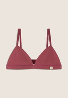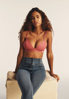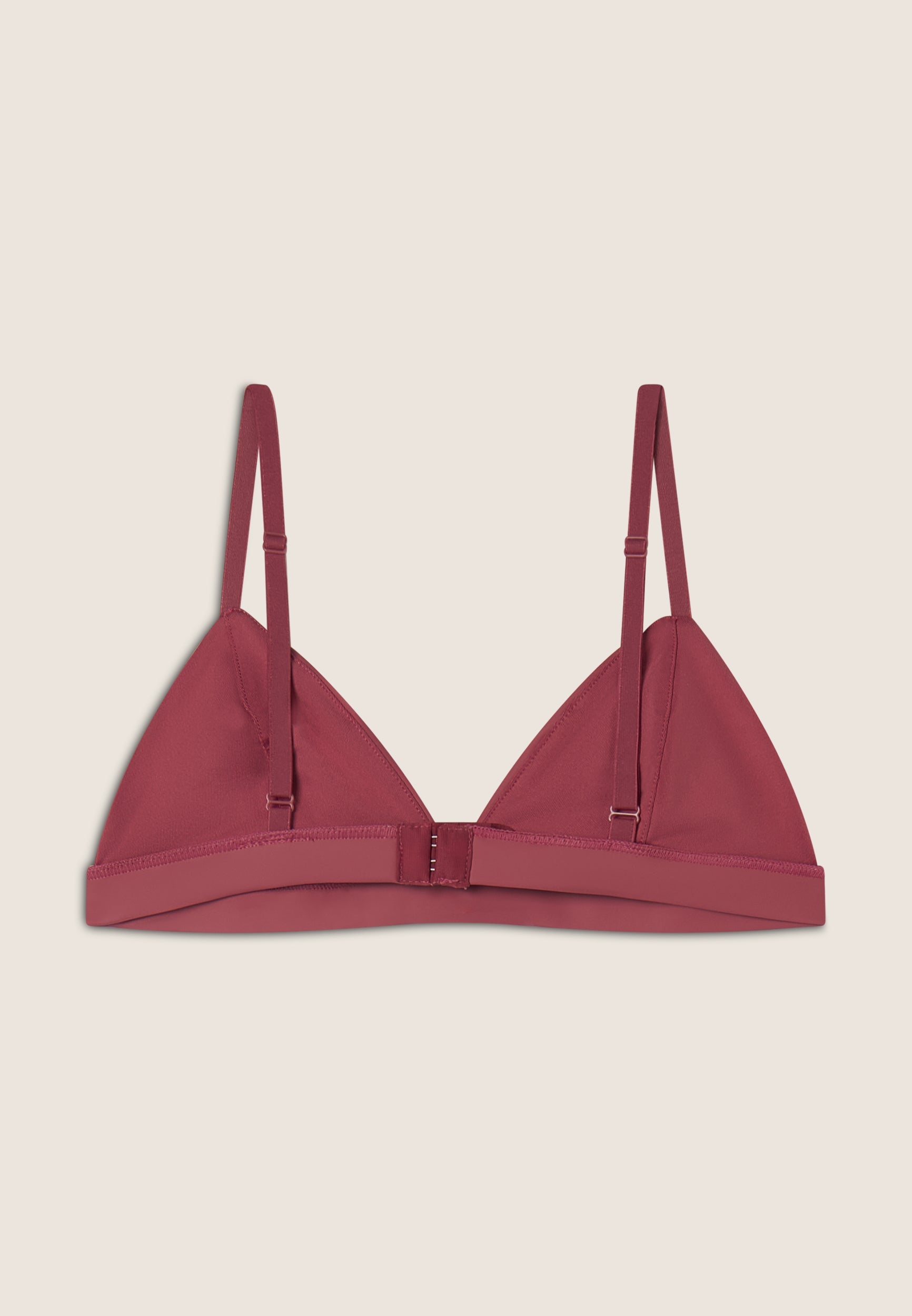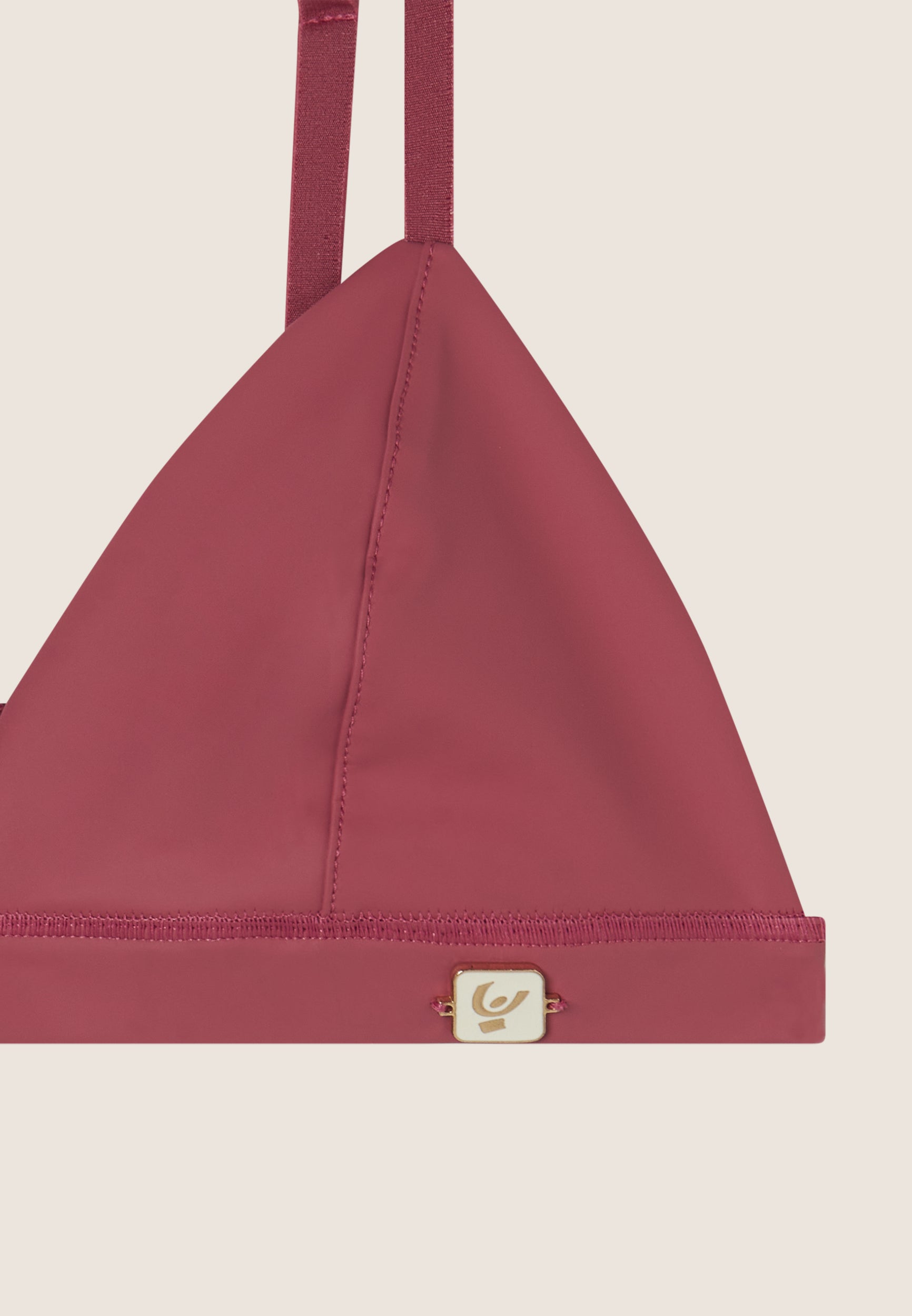 A bra top with an unmistakable shine, made from laminated-effect faux leather with recycled polyester fibres. The design with thin adjustable straps, triangle cups and central seam offers light support and a bold style. The rear hook-and-eye fastener completes the design with practicality.