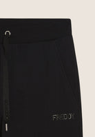Athletic trousers with a regular fit and length, featuring a regular waist with a ribbed band and drawstring for a comfortable fit. The straight leg guarantees a clean, modern silhouette. The FREDDY logo in colour-tone rhinestones on the left side adds a touch of brightness to the garment. Slant pockets with decorative piping on the opening complete the look. The French terry fabric, consisting of modal and cotton with elastane, is soft, breathable and perfect for dynamic comfort.