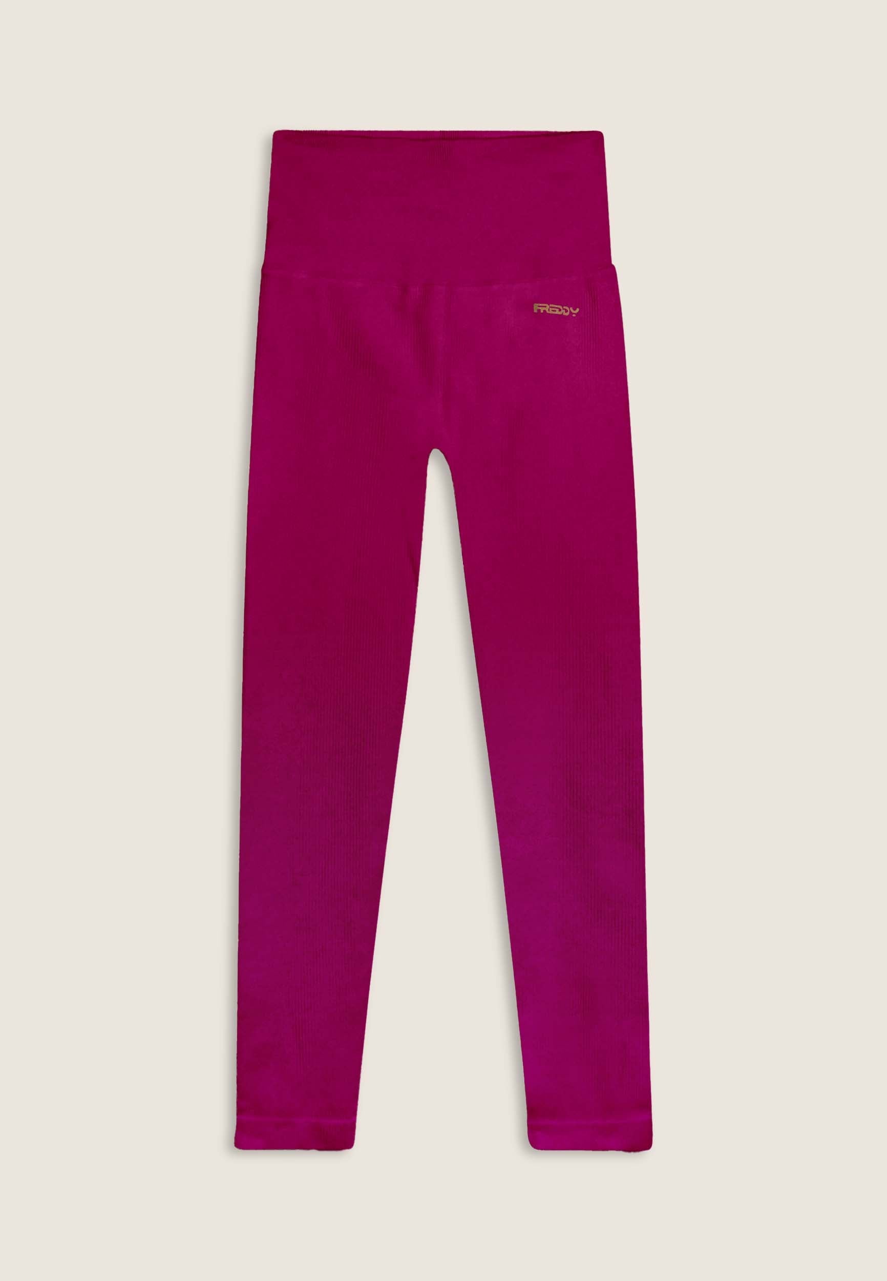 Sports leggings with 7/8 length and skinny leg, made from seamless ribbed fabric for absolute comfort. The very high waist guarantees a stable hold during training, while the heart-shaped seams on the buttocks naturally enhance the shape. Finished with a FREDDY logo on the front and “small man” logo on the back.