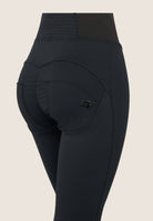 WR.UP® skinny push-up trousers with flared bottom made from breathable D.I.W.O.® performance fabric. The decorative stitching at the waist and the stretch jacquard side inserts enhance the silhouette with elegance. High waist with central zip.